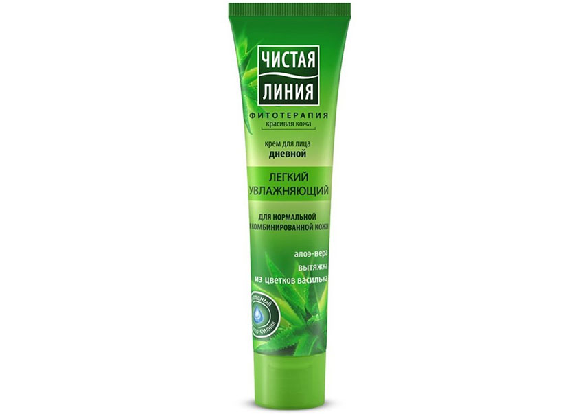 Компания «Чистая линия» позиционирует себя как натуральный уходовый бренд, в состав продуктов входят экстракты настоящих трав. Девушки чаще всего выбирают дневной крем для лица «Легкий увлажняющий». Это нежный крем с воздушной текстурой, который хорошо увлажняет сухую и нормальную кожу. В состав входит вытяжка цветов василька и алоэ. Продукт можно использовать в качестве базы под макияж, так как он профессионально сужает поры, убирает легкие покраснения, матирует и увлажняет. Наносите крем легкими похлопывающими движениями после умывания или перед тональным средством.