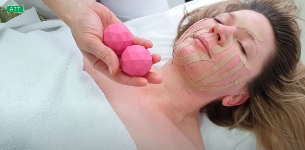 Для усиления эффекта массажа мышц лица производится тейпирование: