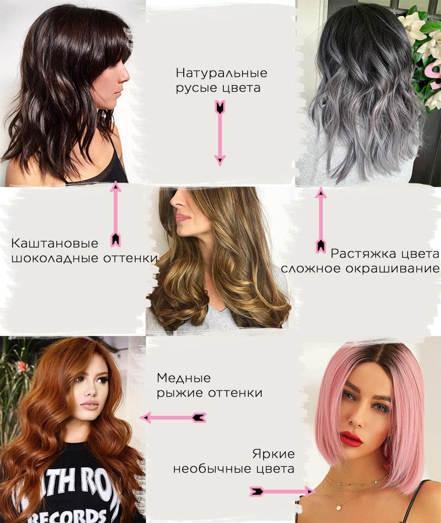 Русый оттенок — простор для фантазии. Отличным решением станут блонд и карамельные тона, яркие решения — розовые или фиолетовые тона.