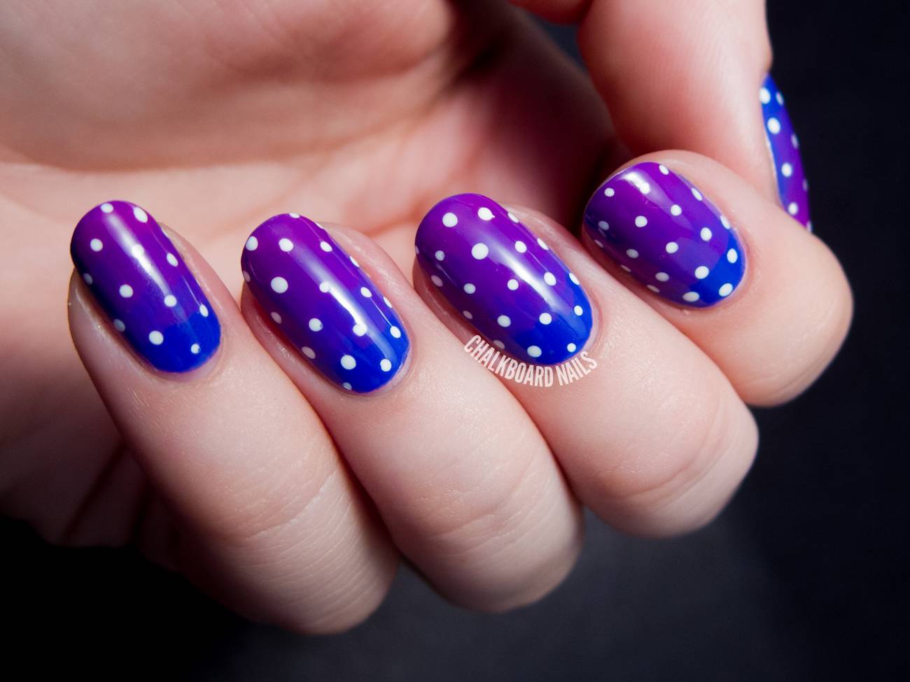 “работает” также и обратная стратегия, когда эффект цветового перехода создается использованием различных оттенков лака на самих точках