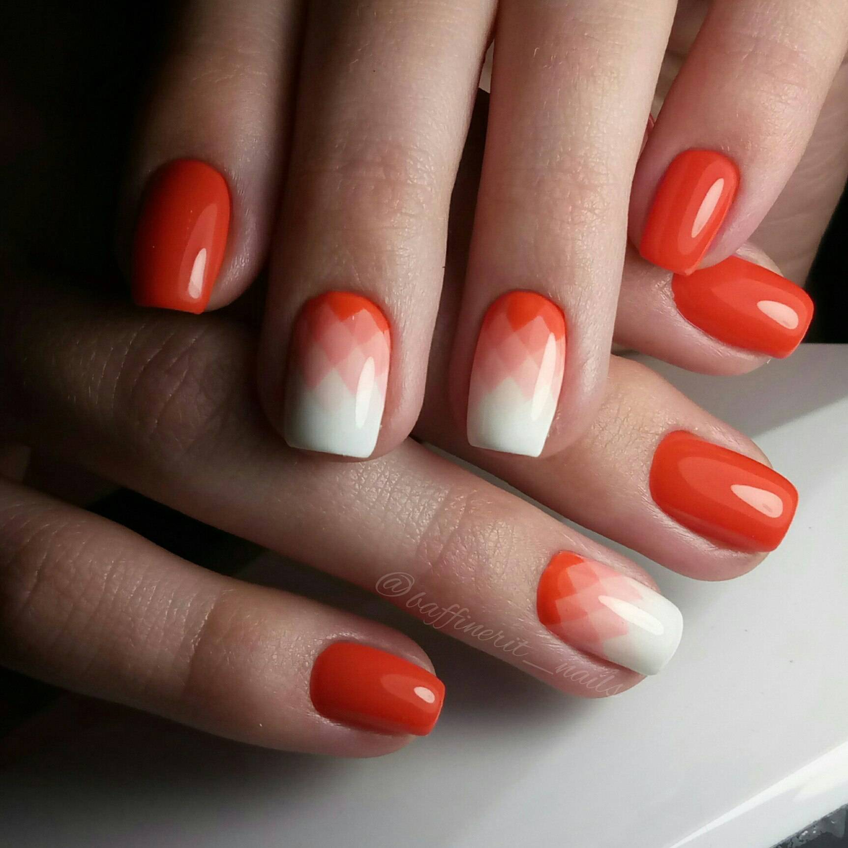 Восхитительно выглядит перевернутый френч с градиентом. Цветовой спектр лучше выбрать яркий, в котором будет виден контрастный переход. Зону кутикулы не стоит окрашивать в другой цвет, лучше, если она останется прозрачной.