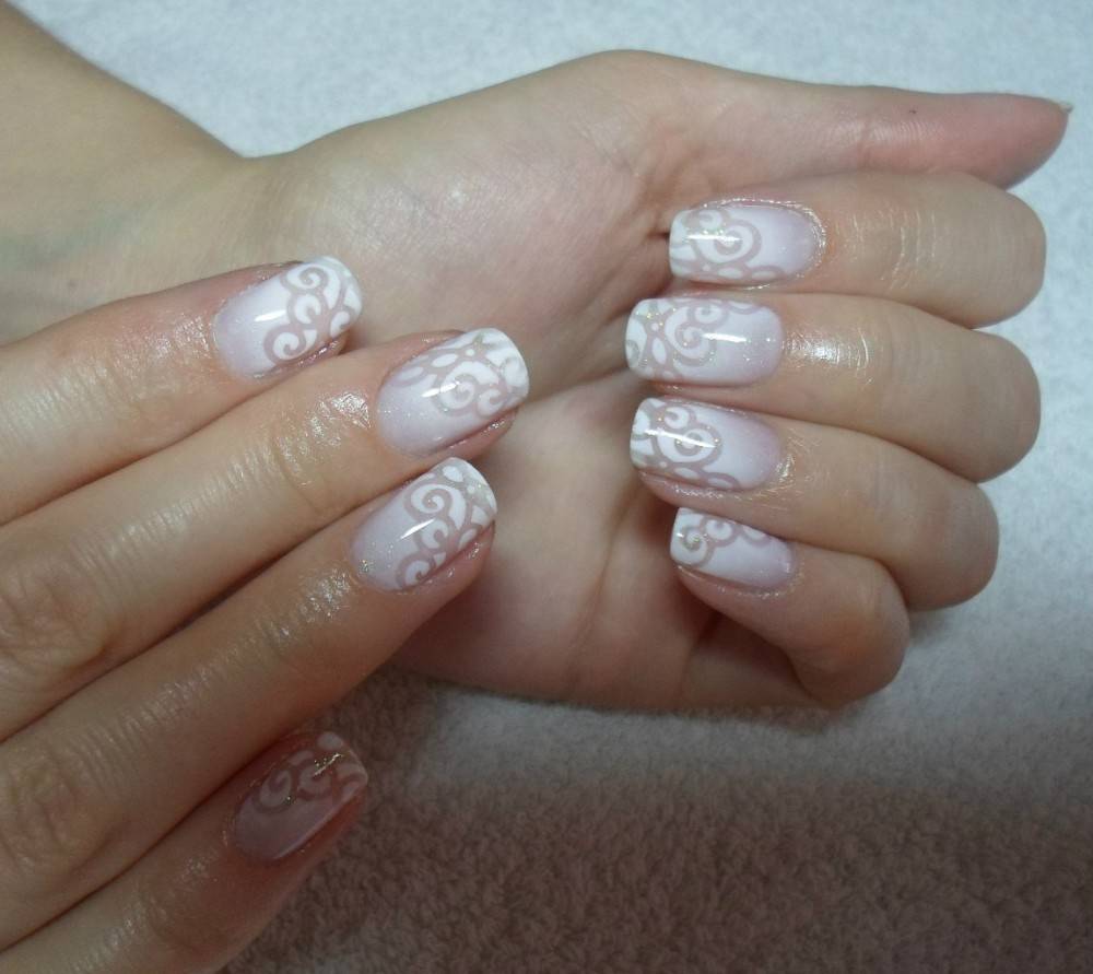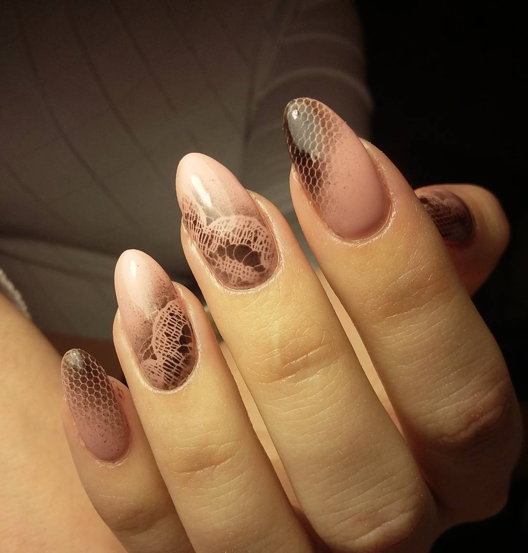 Дизайн ногтей практически всегда выполняют при помощи трафарета. Изысканно и утонченно выглядит вариант с применением гипюра. Кружевной рисунок в черно-белом исполнении подходит абсолютно любой женщине, поскольку маникюр выглядит достаточно сдержано.