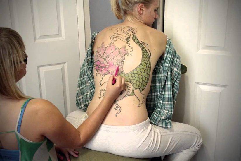 Следующий этап – нанесение чернового изображения на выбранный участок тела, это можно выполнить фломастером или шариковой ручкой. Обязательно предварительно кожные покровы в этом месте обезжириваются с помощью лосьона или медицинского спирта. Если используется трафарет, то его просто прикладывают к коже и смачивают минимальным количеством воды – он будет держаться надежно на всем протяжении процедуры.