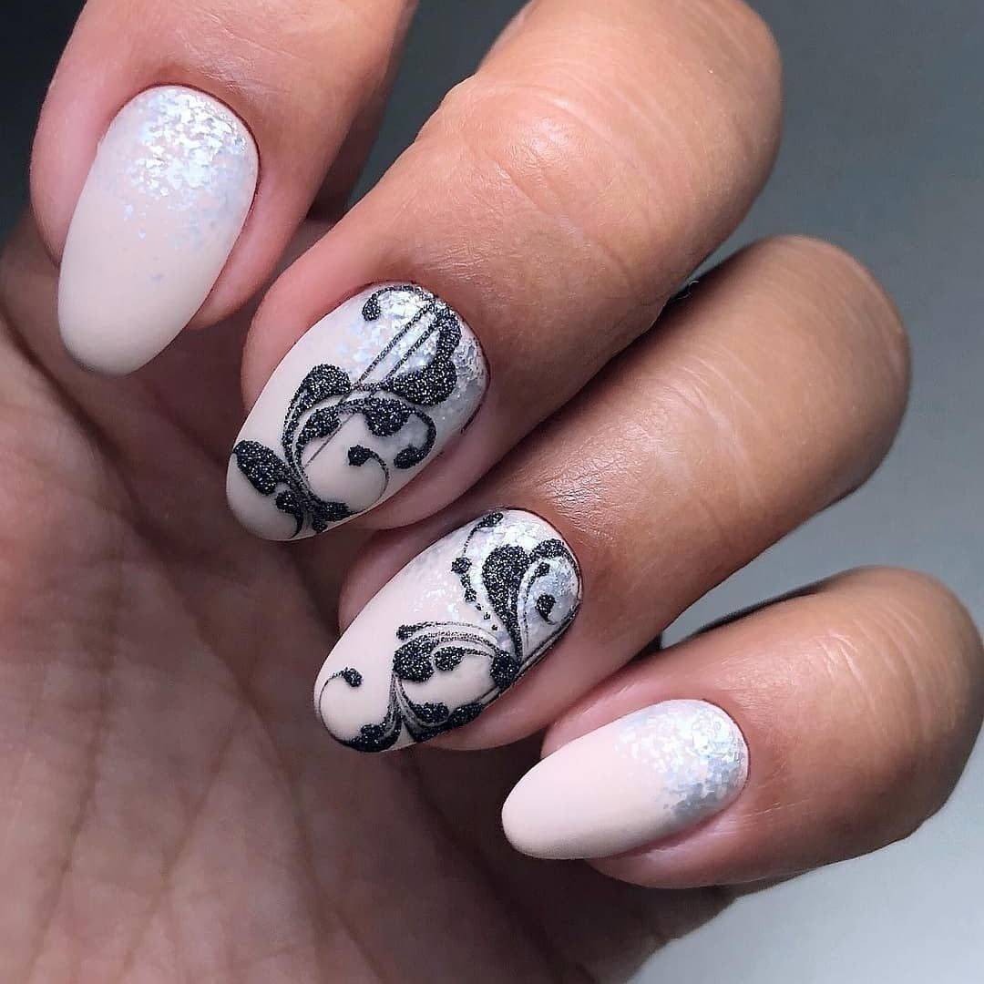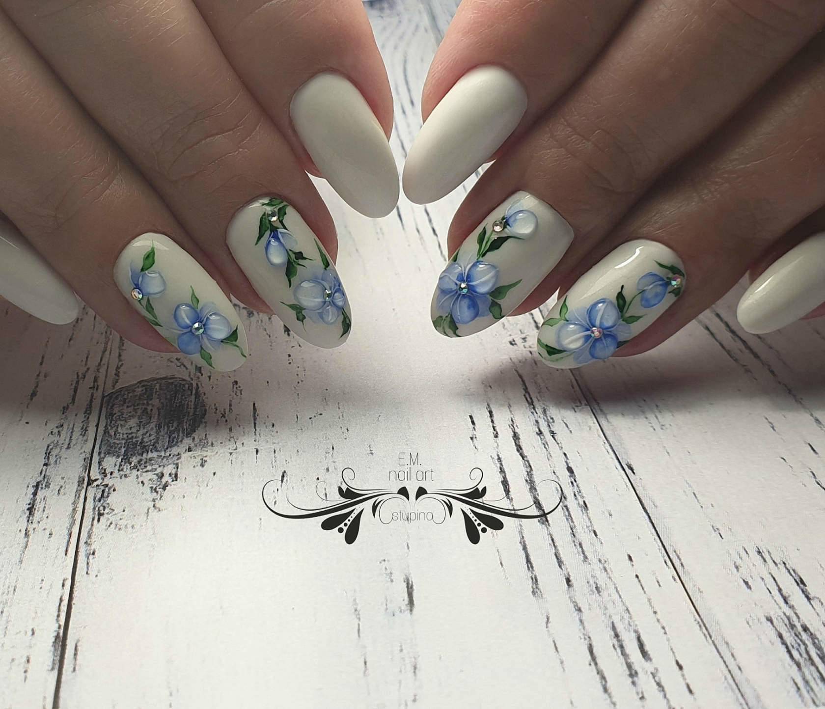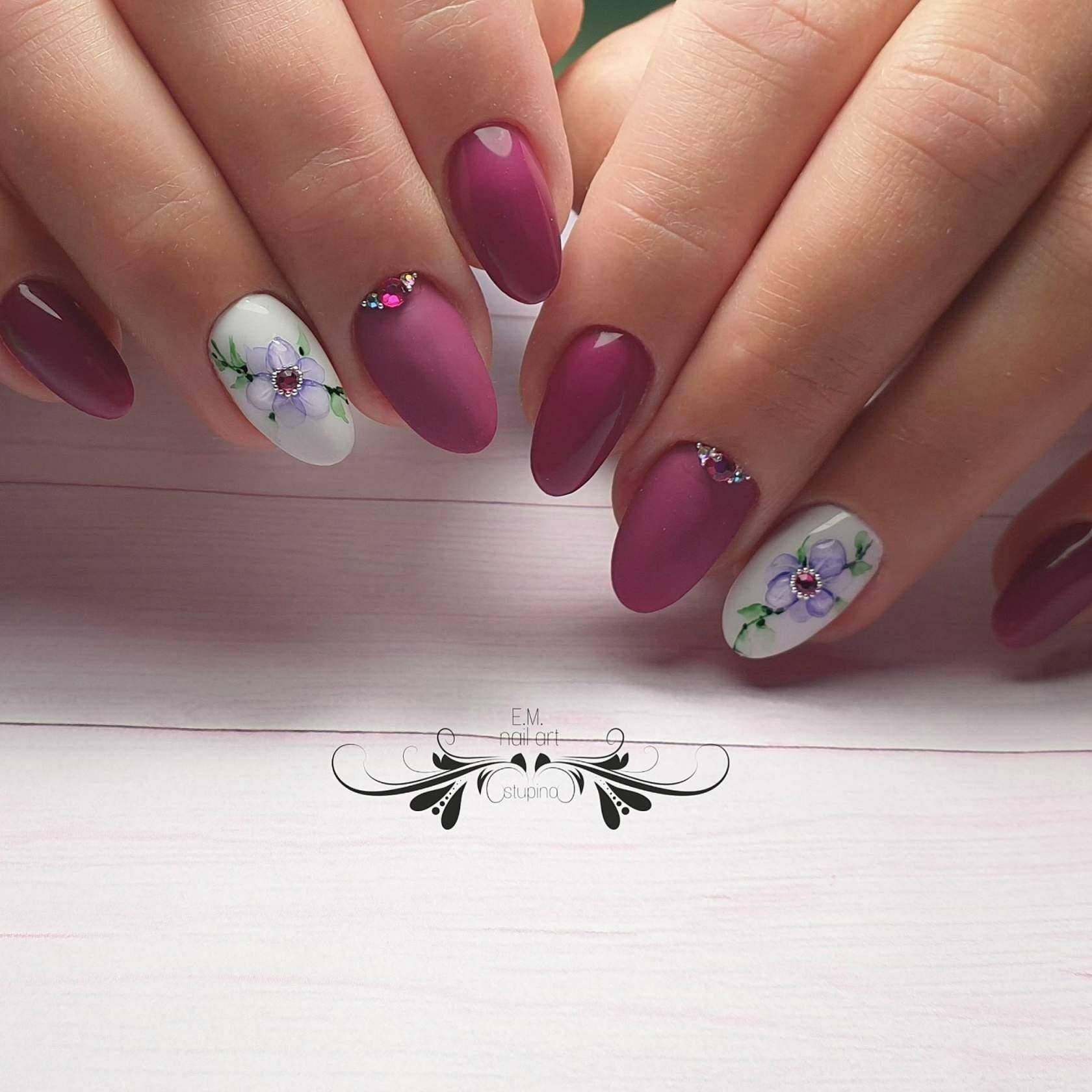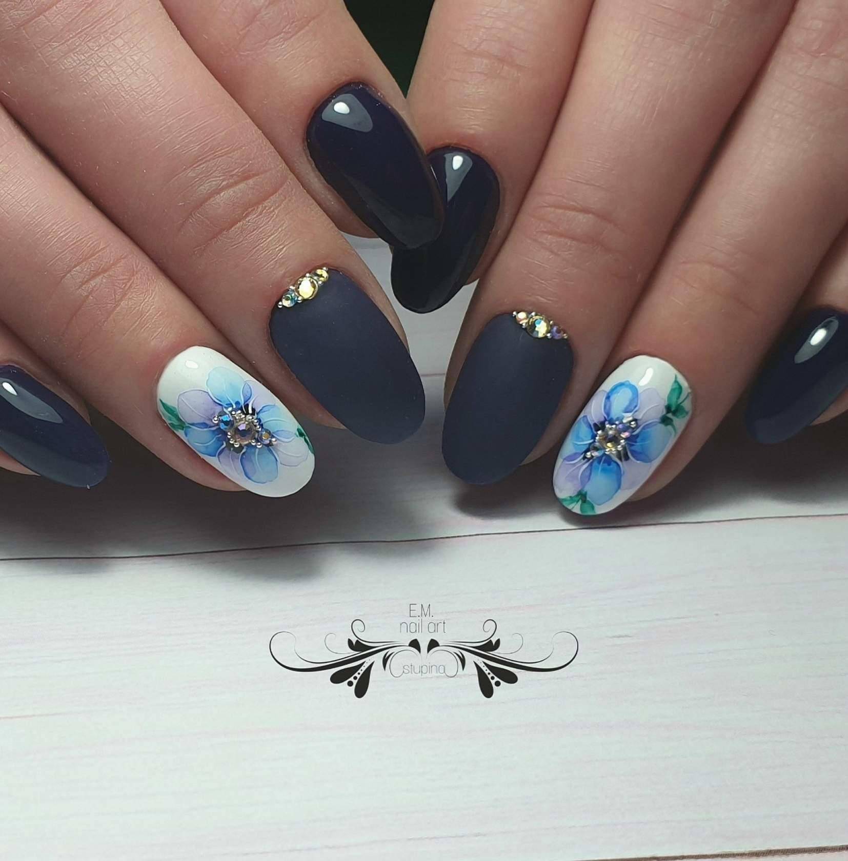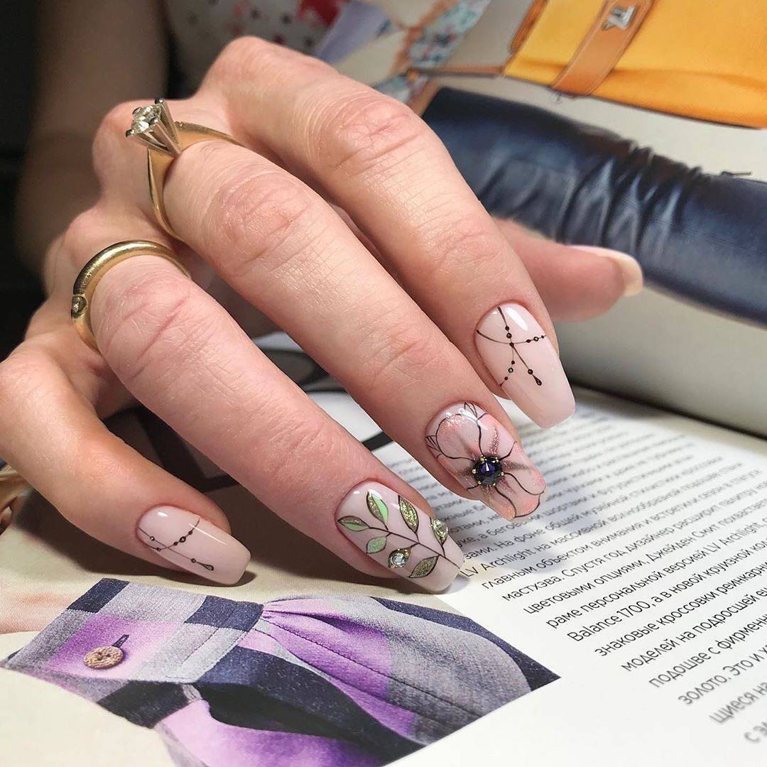 Офисный нейл-арт можно украсить спокойным принтом: изящными завитками, горошинками, геометрическим орнаментом. Сегодня также актуальны тоненькие полоски и аккуратные флористические мотивы. Рисунок на ногтевой пластине может, к примеру, повторять орнамент одежды.