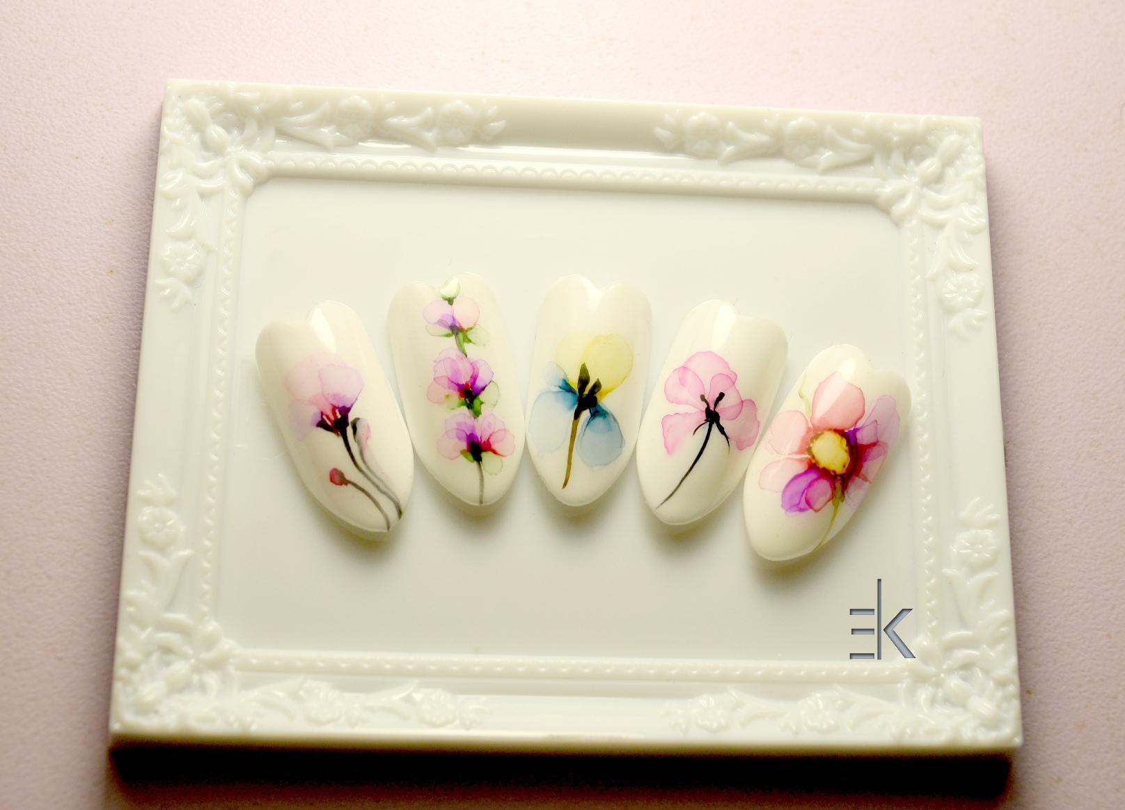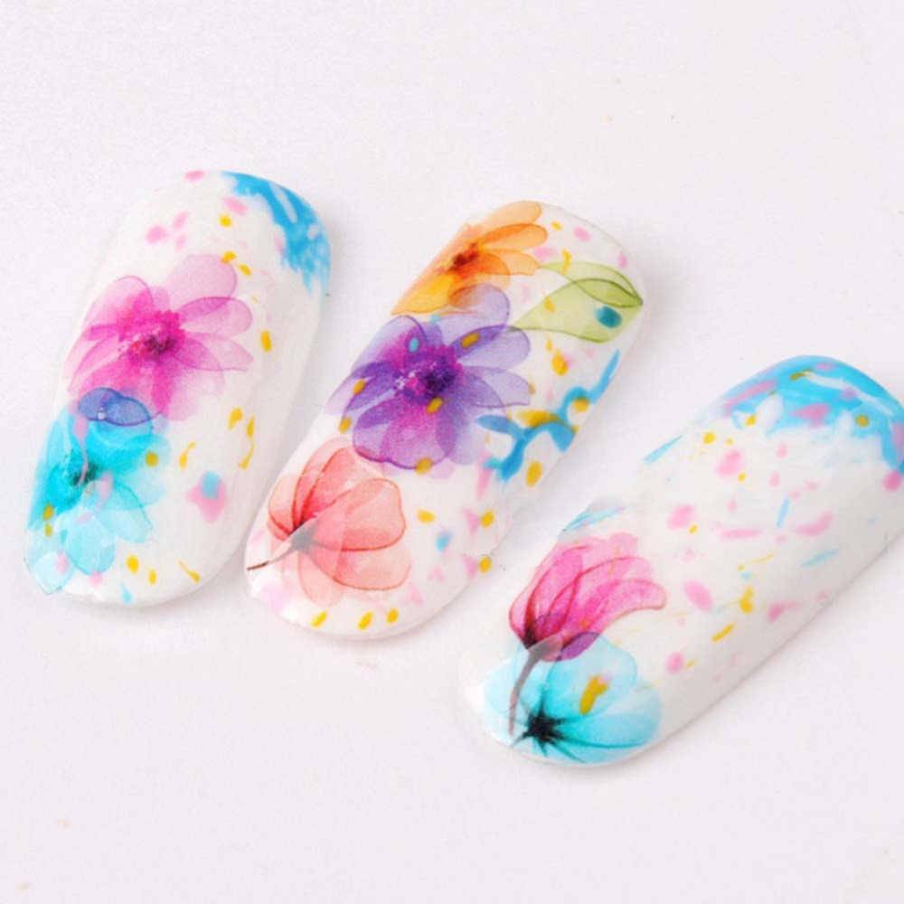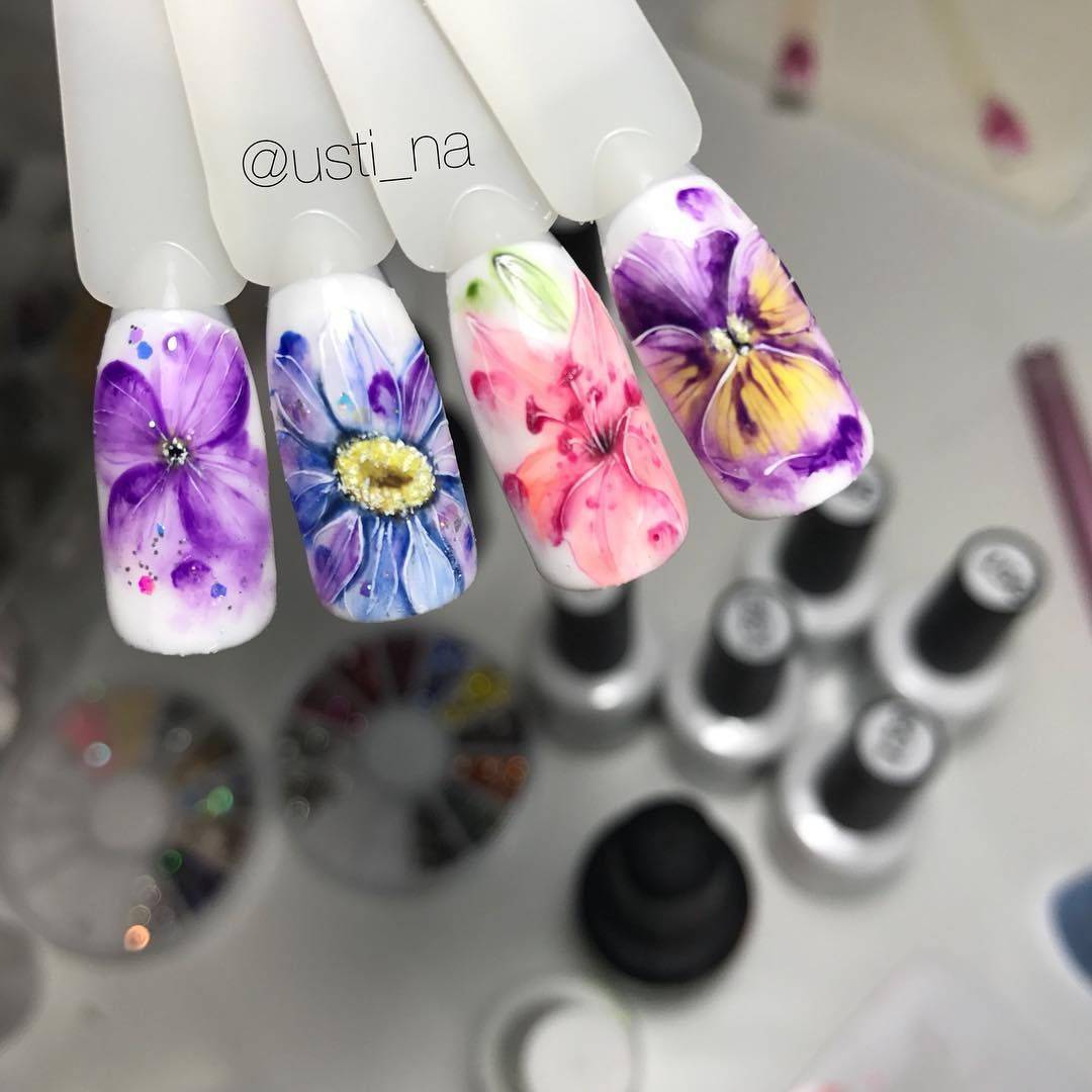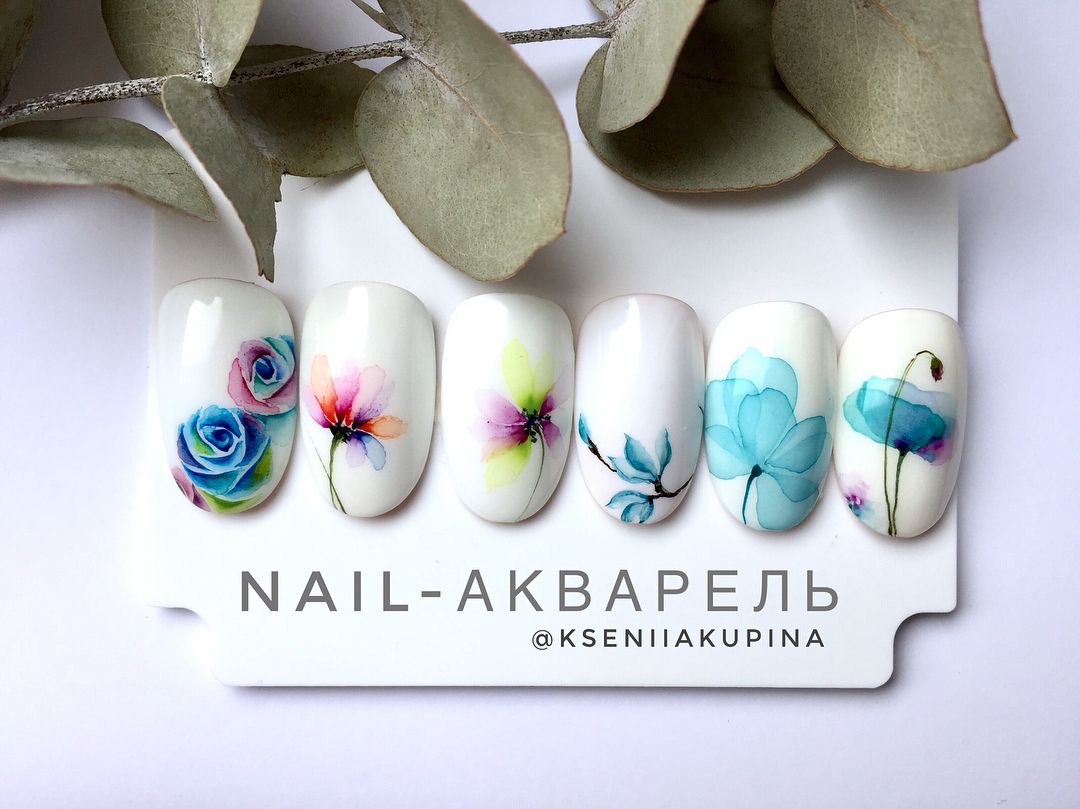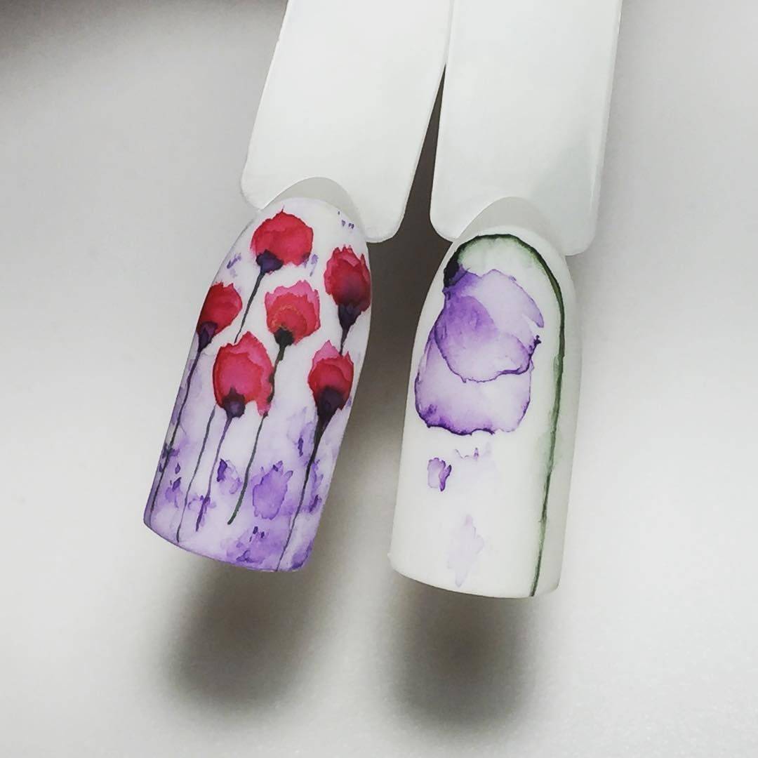 Мастеров нейл-арта способность акварельных пигментов создавать нежные романтичные узоры тоже не оставляет равнодушными. Краской на водной основе рисуют абстрактные узоры, цветы и другие картины, которые подсказывает фантазия мастера. Акварель дает возможность воплотить любые капризы.