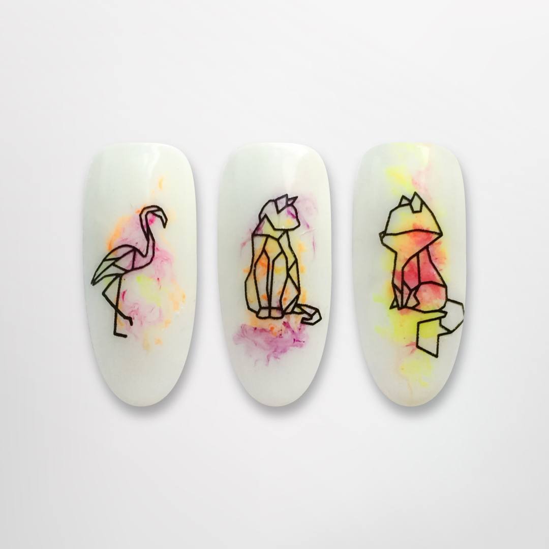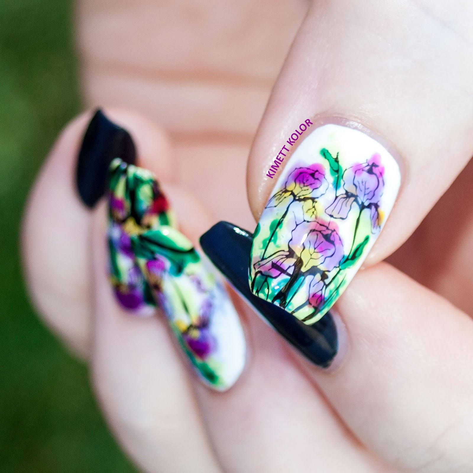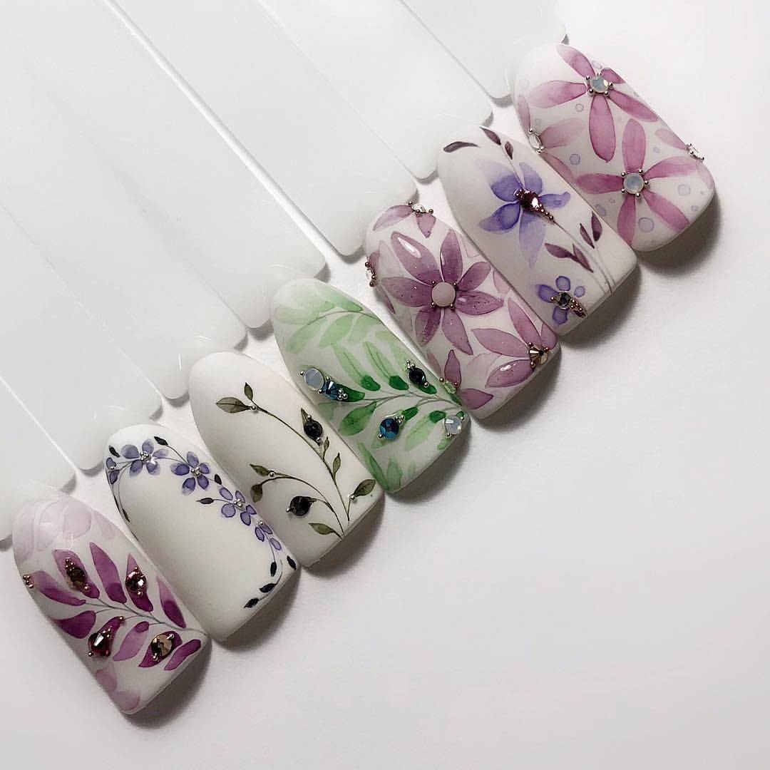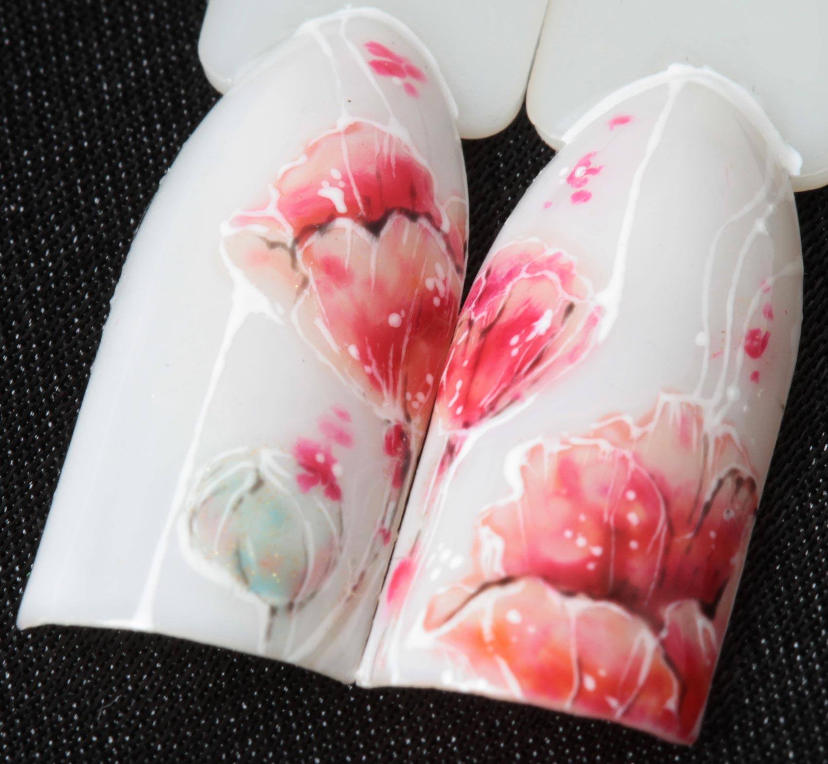 Мастеров нейл-арта способность акварельных пигментов создавать нежные романтичные узоры тоже не оставляет равнодушными. Краской на водной основе рисуют абстрактные узоры, цветы и другие картины, которые подсказывает фантазия мастера. Акварель дает возможность воплотить любые капризы.