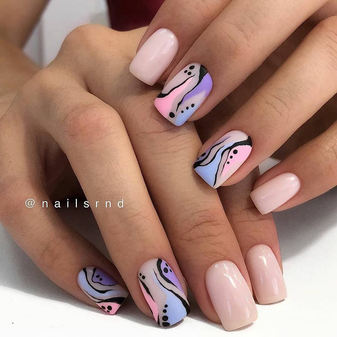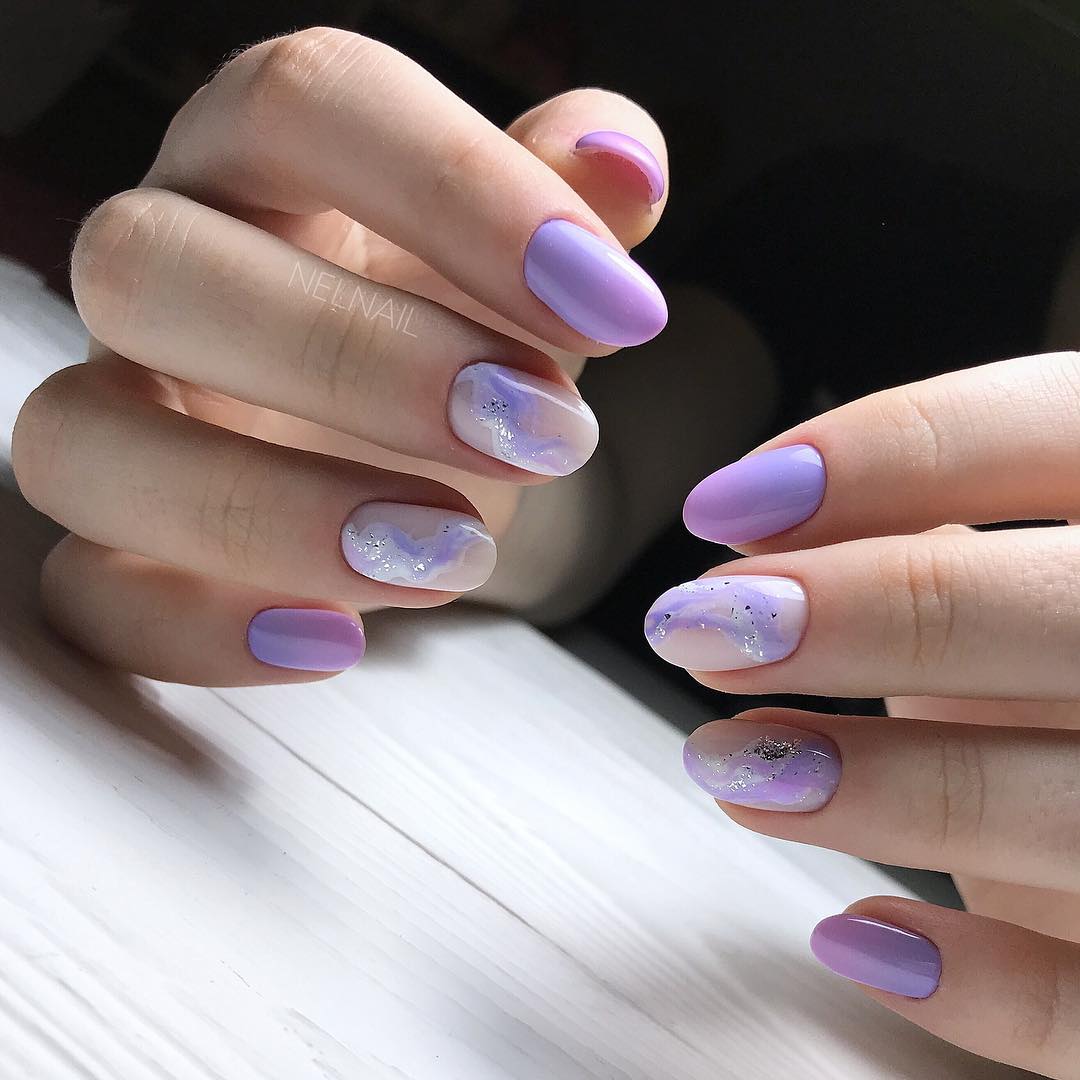 Любительницам коротких ногтей стоит присмотреться к таким цветам как лиловый, лавандовый, небесный и пыльная роза. Небольшая длина — это практично и к тому же стильно, особенно в сочетании с женственными нежными оттенками.