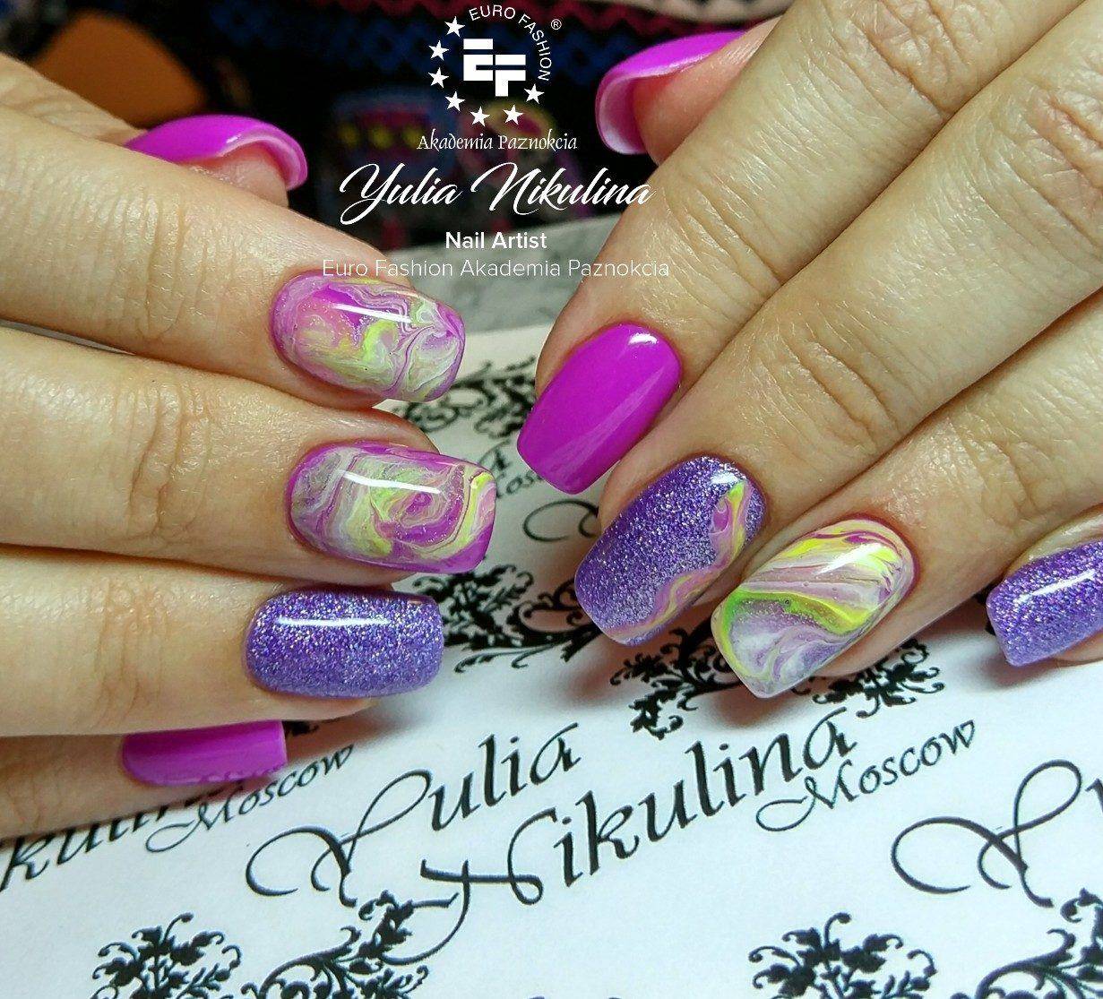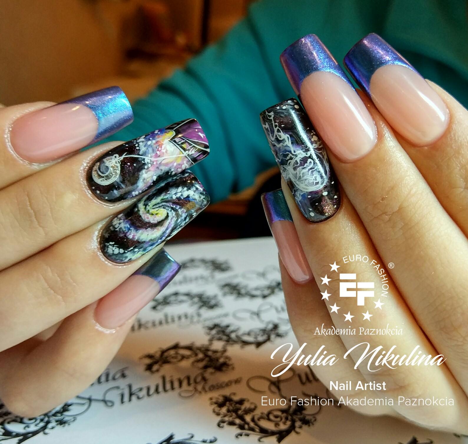 - Капни немного краски на фольгу или палитру и с помощью тонкой кисти создай необходимый узор на ногтях. При необходимости размыть пигмент, смочи кисть в обезжиривателе и потом набирай на нее краситель;