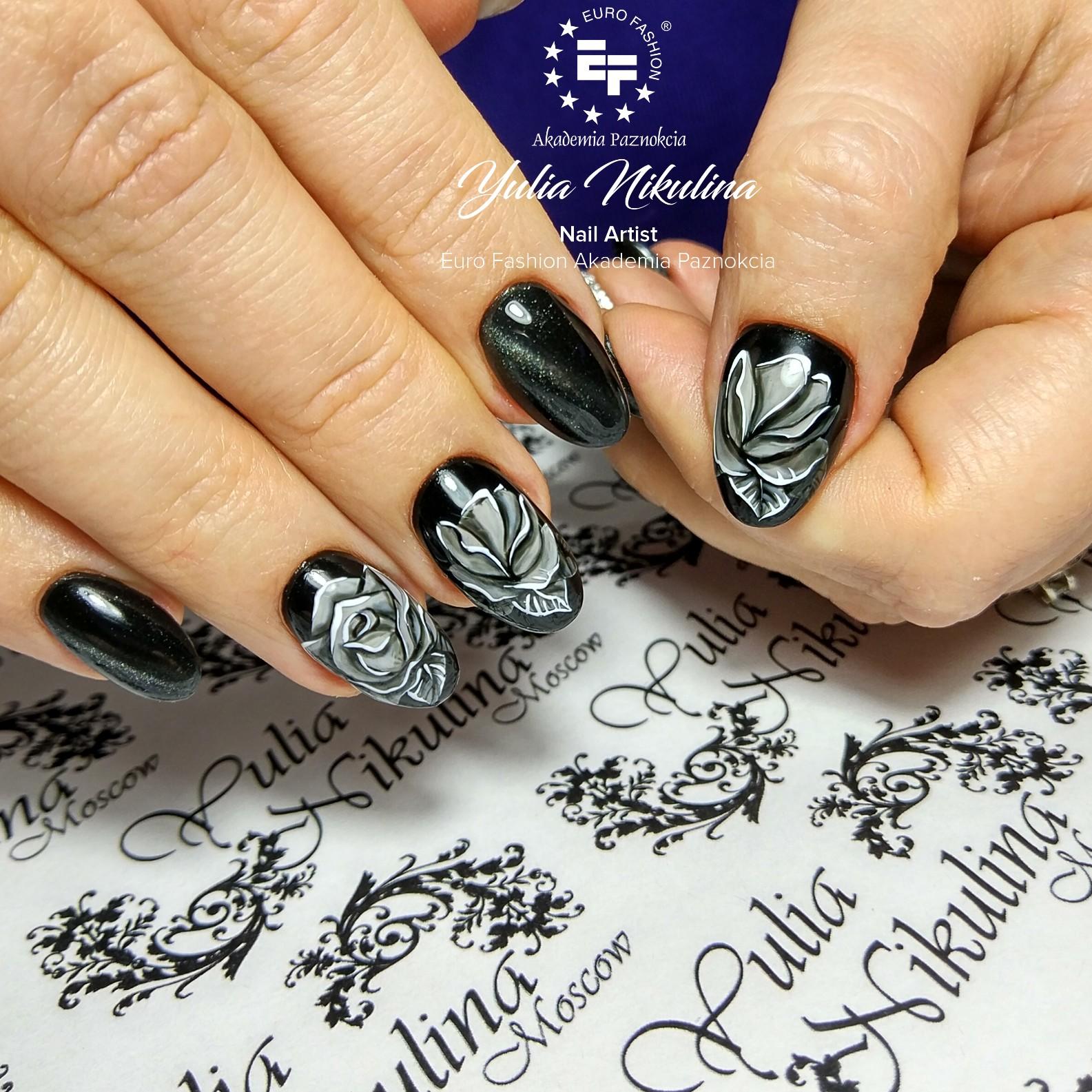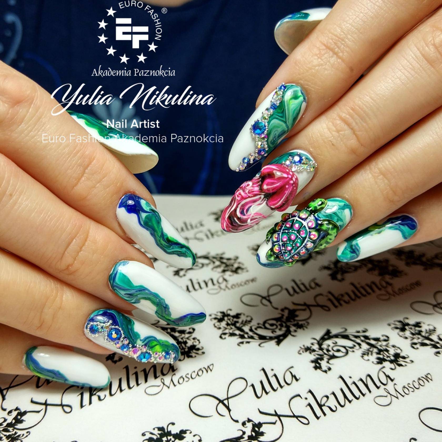 Для создания выпуклых изображений: складок на ткани, внутренней части цветка и прочего, используют свойства акварели. Для того чтобы не наносить множество слоев для достижения задуманной объемности предметов, можно пойти методом от противного: сначала нанести насыщенный цвет, а затем уже сухой кистью вымыть его там, где это необходимо. Нейл-арт можно украсить дополнительными материалами, например, фольгой или слюдой.