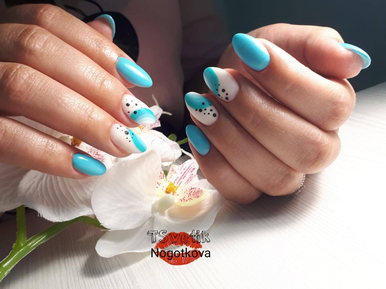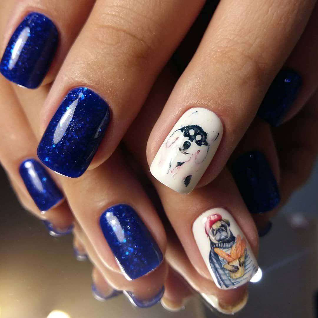 Небесно-голубой цвет лака на коротких ногтях выглядит изящно и стильно. Результат будет интереснее, если добавить в дизайн асимметрии: покрыть блестками один палец на одной руке и два — на другой.