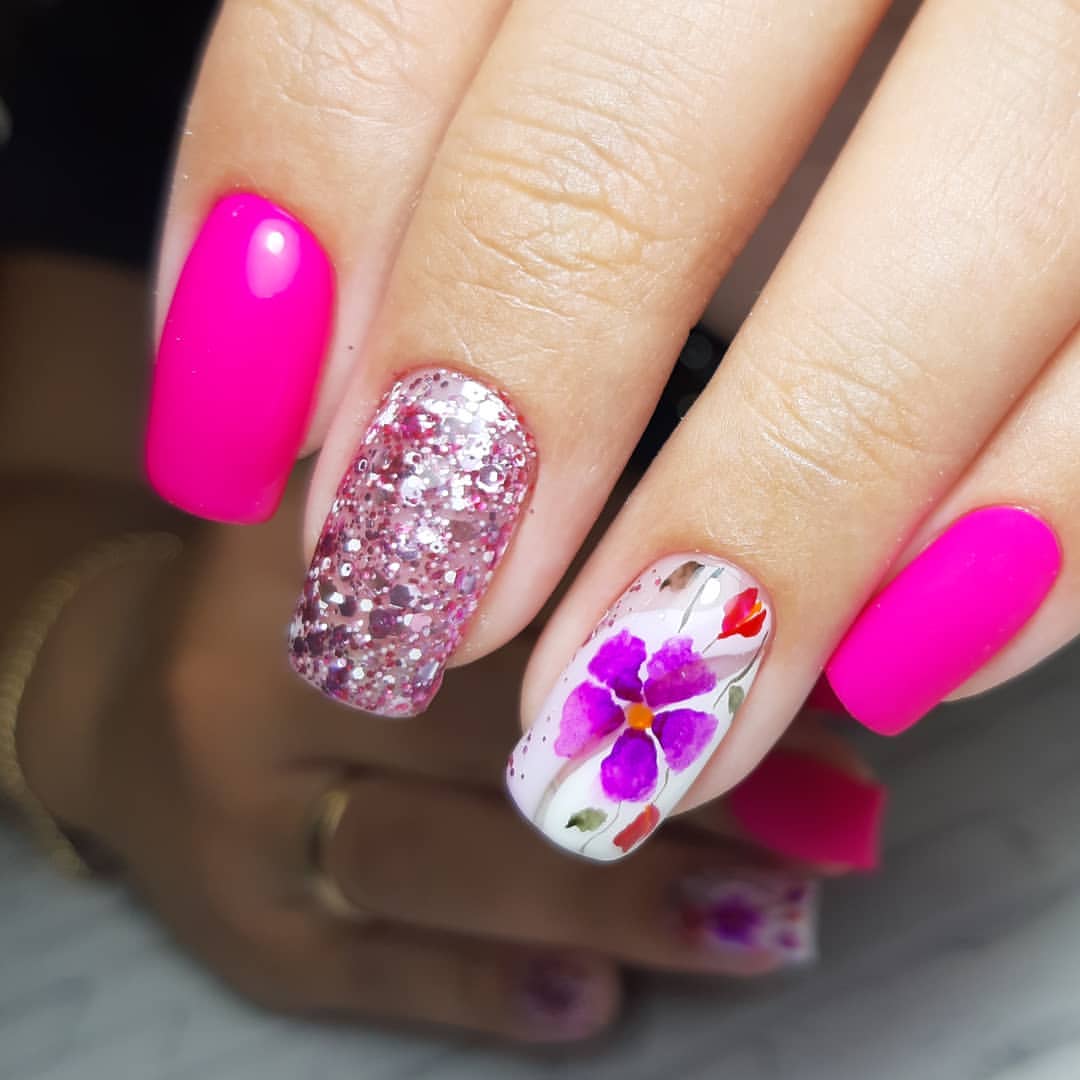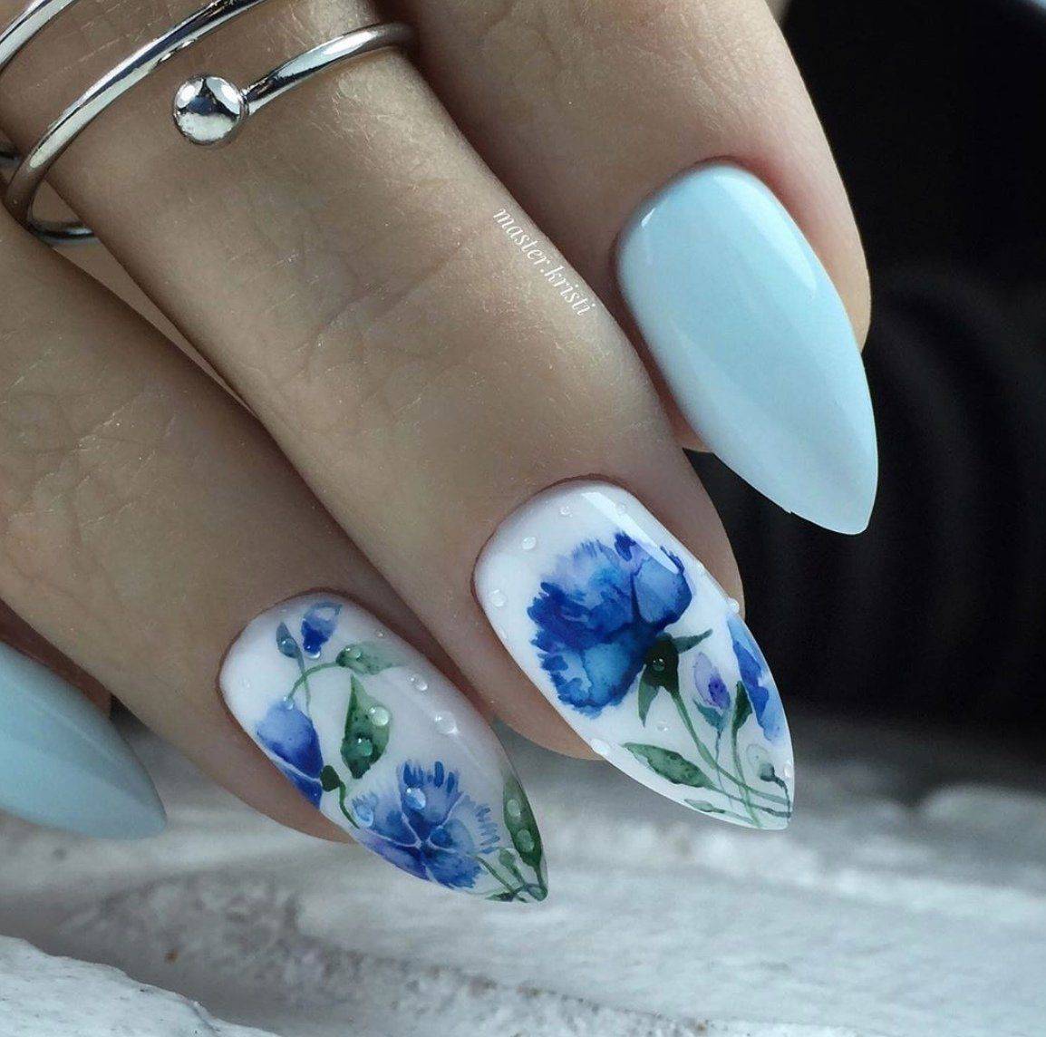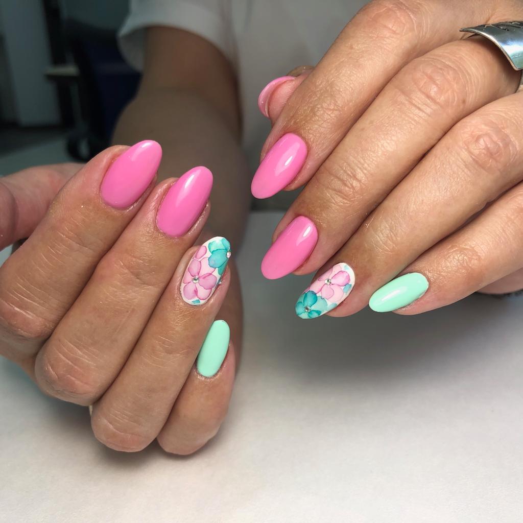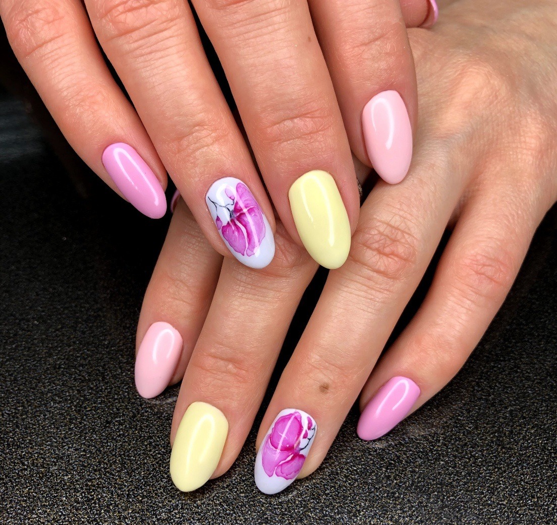 Выигрышно будут смотреться акварельные разводы в стильной технике минимализм или абстракция. Маникюр с цветочными рисунками давно перестали быть прерогативой ишь модниц с длинными ногтями. Лаконичные и милые идеи дизайна прекрасно смотрятся и на натуральной длине. Главное условие – это умеренность в палитре и декоре.