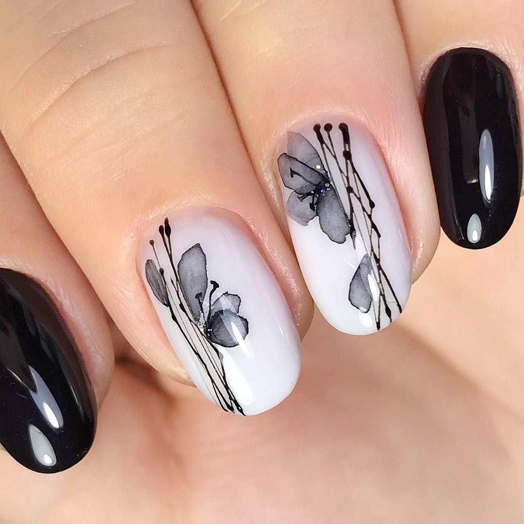 К флористике также относятся изображения с веточками, листьями, бутонами в темном цвете. В таком маникюре цветы могут вообще не присутствовать, но дизайн все же будет считаться флористикой. Даже при отсутствии цветов на ногтях маникюр будет смотрится очень нежно и красиво, особенно если соблюден контраст между светлым фоном и темным узором.