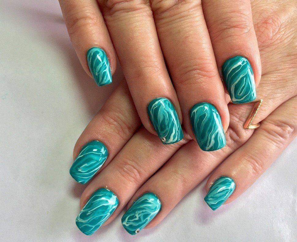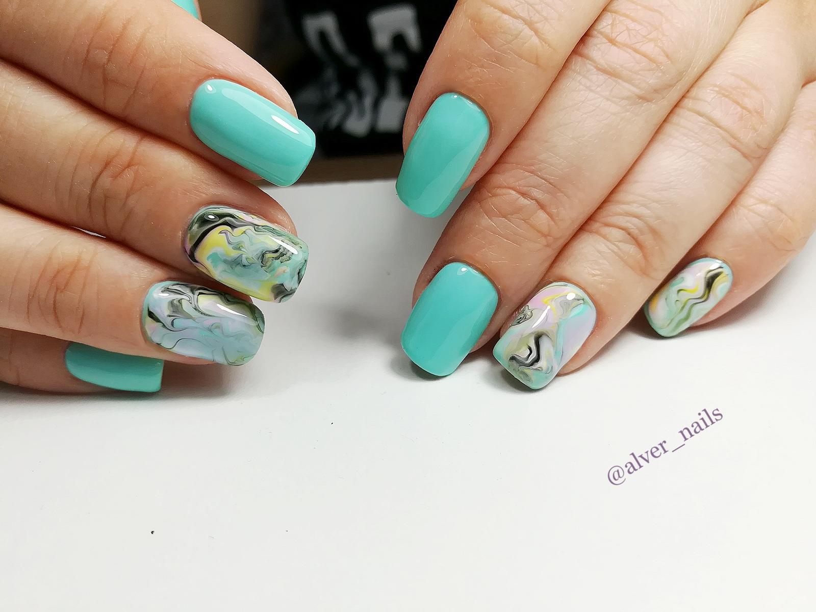 Маникюр с акварелью можно воплотить и на коротких ногтях. Конечно, такая длина вряд ли позволит воссоздать сложные пейзажи и разноцветные композиции. Дело в том, что такой дизайн выглядит на коротких ногтях броским, перегруженным и сложным для восприятия.