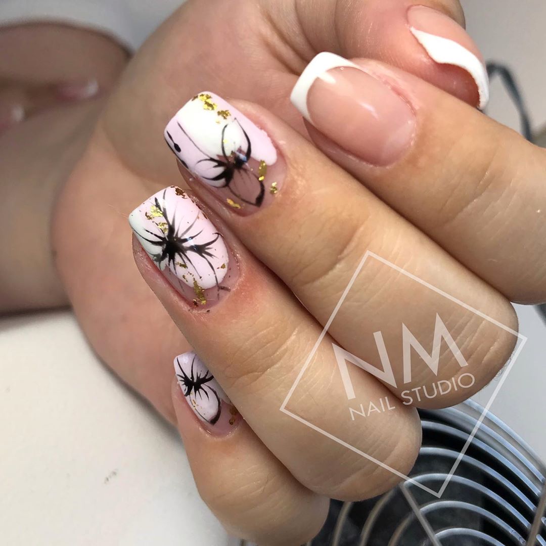 И, наконец, классическое сочетание — розовый с белым. Белый можно выбрать не только для фонового покрытия, но и в качестве цвета рисунка. На фото белым нарисованы веточки на безымянном пальце и мизинце. Любопытная деталь, которая не бросается в глаза: на этих двух пальцах отпечатана золотая фольга с цветами, что делает маникюр еще более оригинальным.
