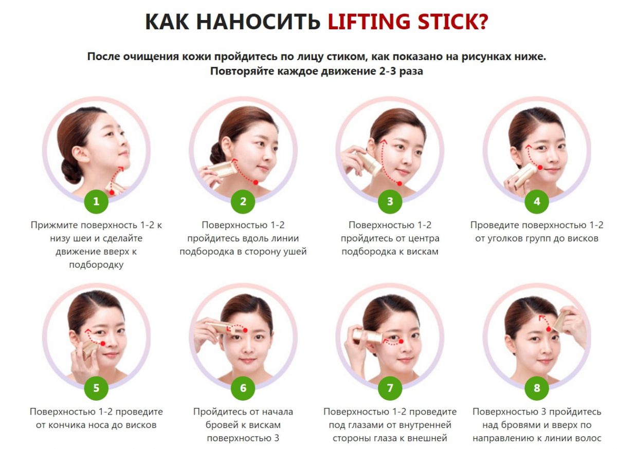 Lifting Stick имеет особую форму, повторяющую контуры лица. Она состоит из четырёх пронумерованных сторон. В каждую упаковку вложена подробная инструкция, как и какими сторонами правильно наносить состав. До начала использования очистите кожу. При массаже соблюдайте последовательность действий: