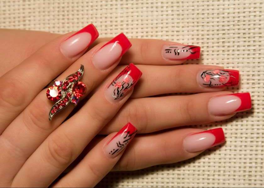 При создании красного френча необходимо обращать внимание на форму ногтевой пластины и «улыбки». Сегодня очень модно использовать необычную форму «улыбки» (вертикальную, косую или смещенную)