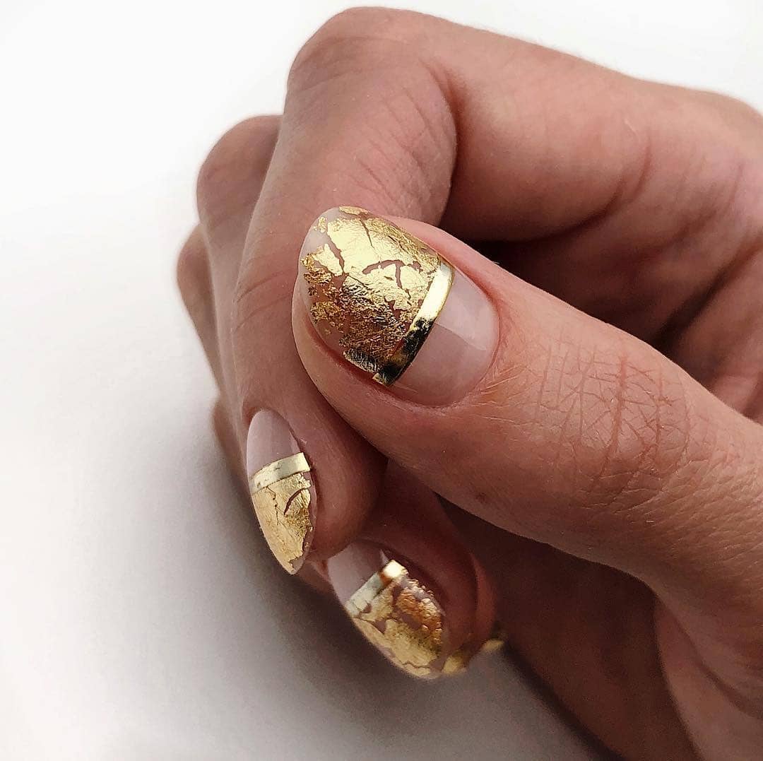 Классический пример френча с геометрией – это дизайн с треугольным краем ногтя. Выполнить его гораздо проще, чем классическую форму. Для этого можно использовать готовые трафареты или прикладывать к краю ногтя ровную фольгу или бумагу.