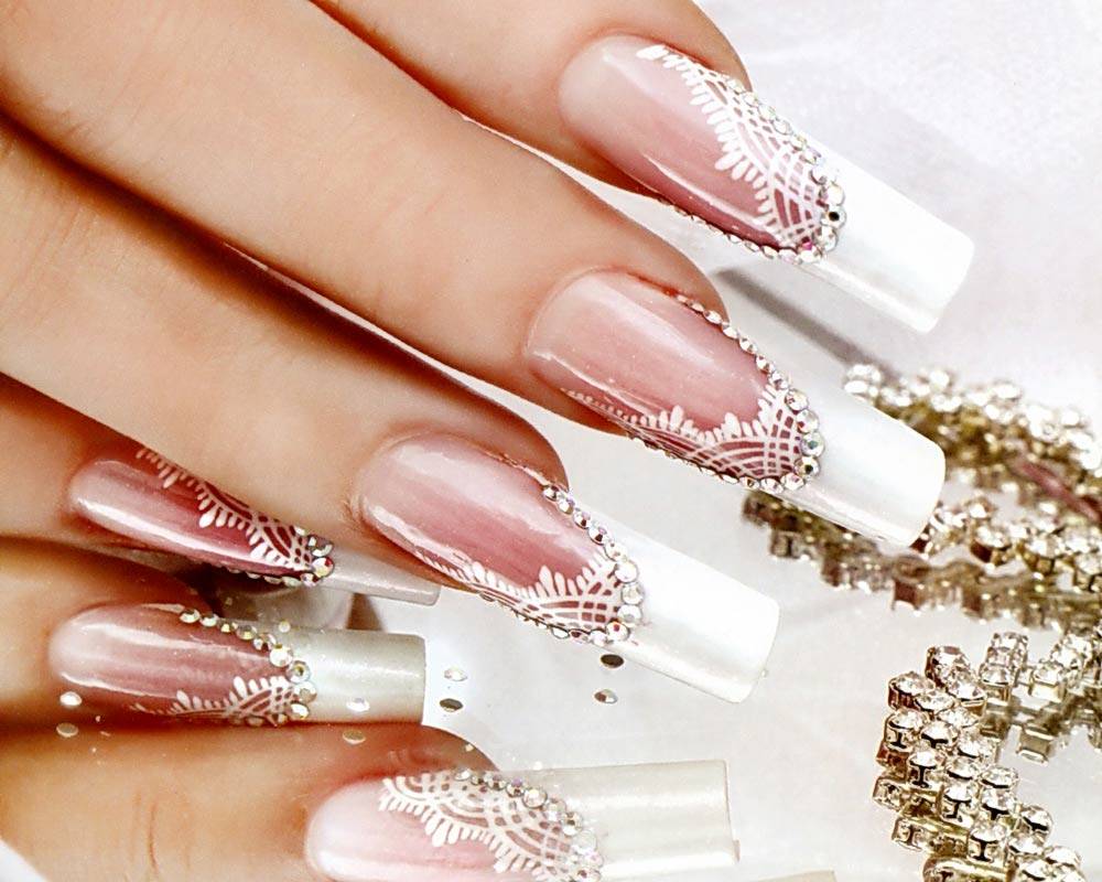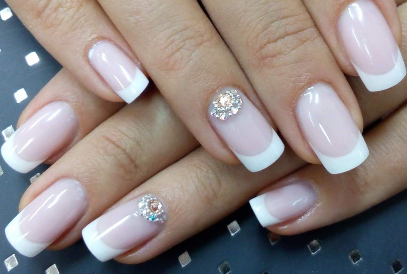 Нежный французский маникюр актуален в любое время года и к любому образу. Все чаще мастера нейл-дизайна предлагают его разнообразить необычным дизайном. Нежный френч создают с помощью нежно-розового, серого и бежевого цветов. Если вы хотите разнообразить нежный френч, то украсьте его ажурным рисунком. Такой рисунок делают как на отдельном ноготке, так и на всех. Нежный французский маникюр сочетается с камнями и блестками. При этом вы должны помнить, что всего этого должно быть не много, так как френч должен оставаться нежным, а не вызывающим. Такой маникюр дополнит образ любой невесты.