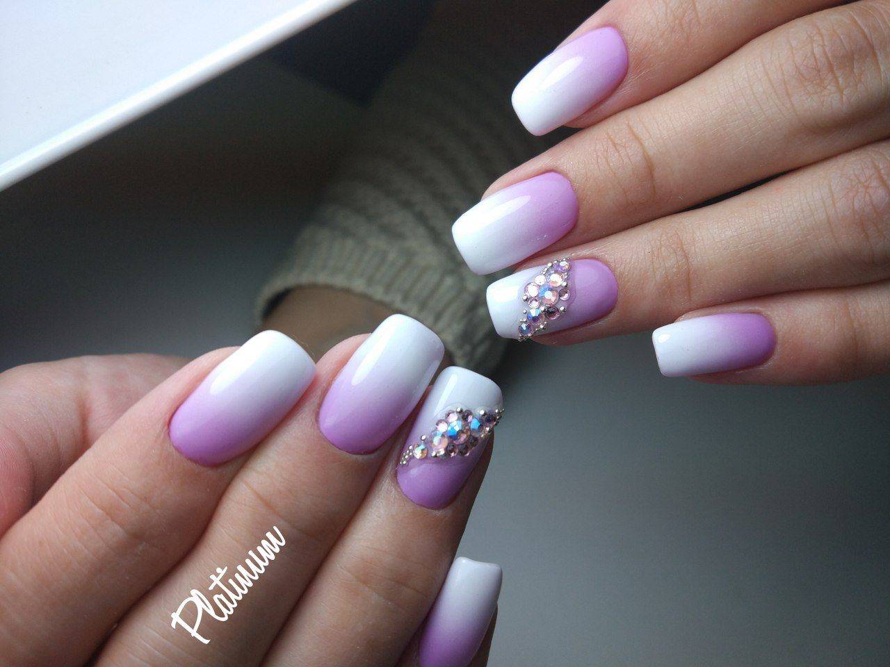 Также часто фиолетовый цвет сочетают с яркими цветами, такими как розовый, голубой, зеленый или мятный. При добавлении разнообразных оттенков и цветов к фиолетовому французскому маникюру стоит учитывать и тот момент, что более темные цвета будут утяжелять такой маникюр, а более светлые будут его смягчать. Необходимо правильно и грамотно дозировать количество контрастного цвета, чтобы избежать неправильных эффектов.