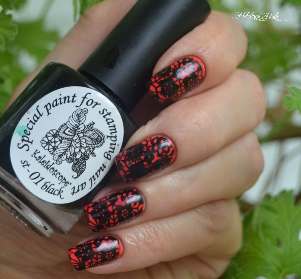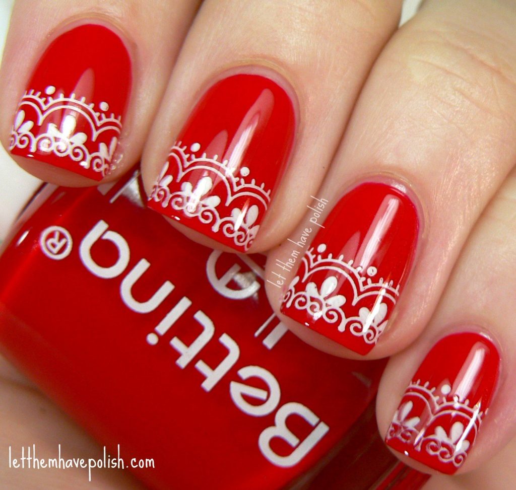 Ажурный рисунок на контрастном фоне – это гламурный шик. Вариантов бесконечное количество. Классикой, конечно же, считается черное или белое кружево на красном пигменте