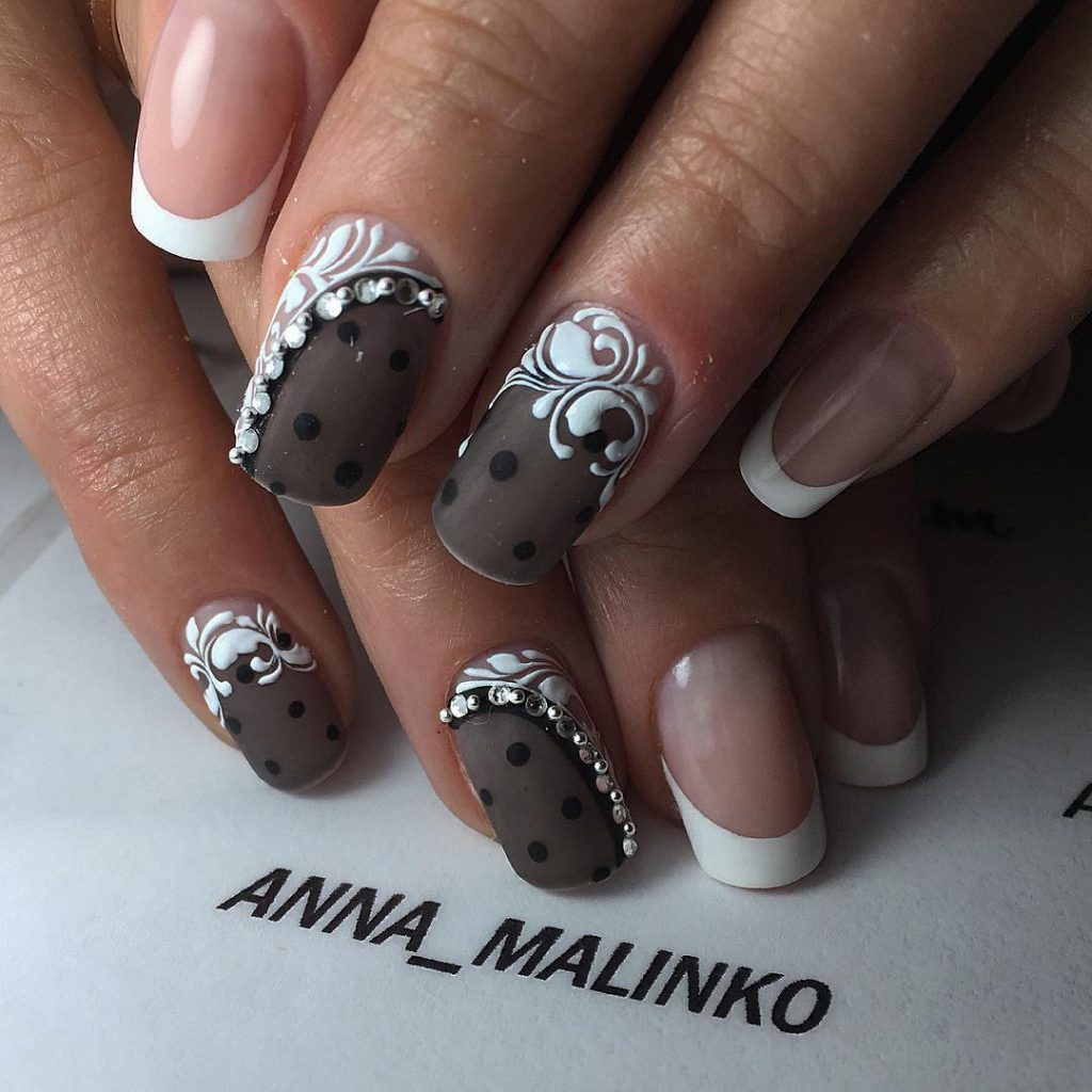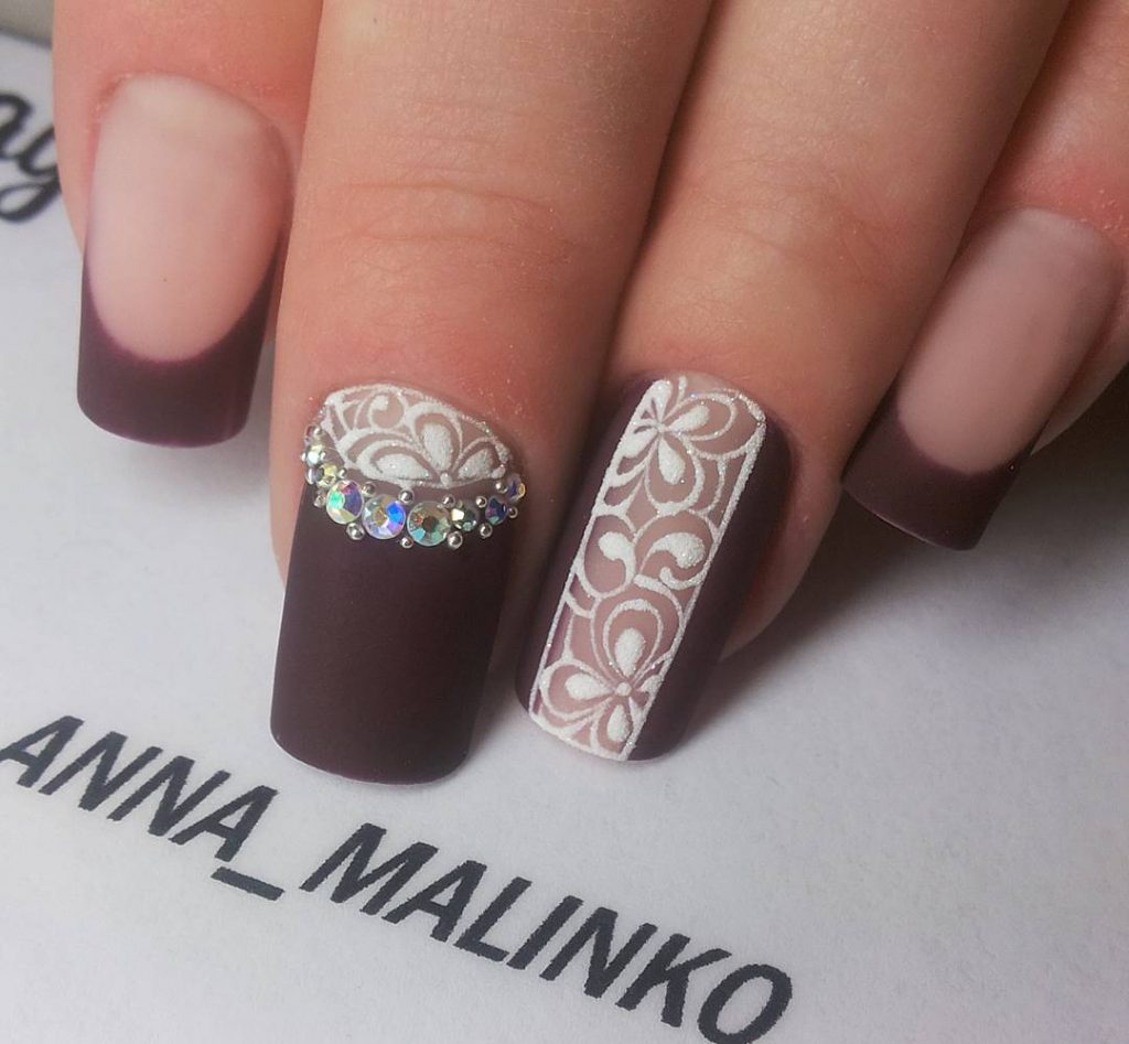 Самое изысканное и гармоничное сочетание – это, конечно же, френч с кружевом. Он может быть выполнен как в светлых оттенках, например, свадебная тематика и романтичный нежный образ, так и в контрастных цветах, если речь идет о деловом и офисном стиле.