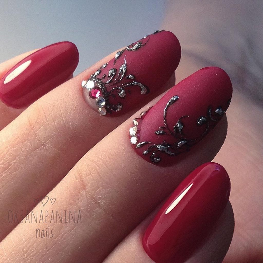 Матовые ногти с ажурными элементами визуально напоминают дорогое кружево и шикарный бархат. Ноготки с этим дизайном смотрятся очень богато и роскошно.
