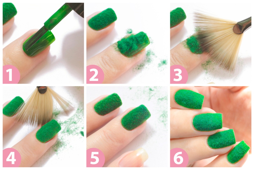 После нанесения флока на поверхность ногтей они приобретают пушистую бархатистую поверхность напоминающей кашемир и велюр.
