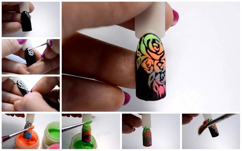 Используя такой способ создания сахарного маникюра можно добиться эффекта бархата.Для этого узоры сначала прорисовывают гель-лаком, а потом контуры присыпают пудрой, а все лишнее удаляют кисточкой.