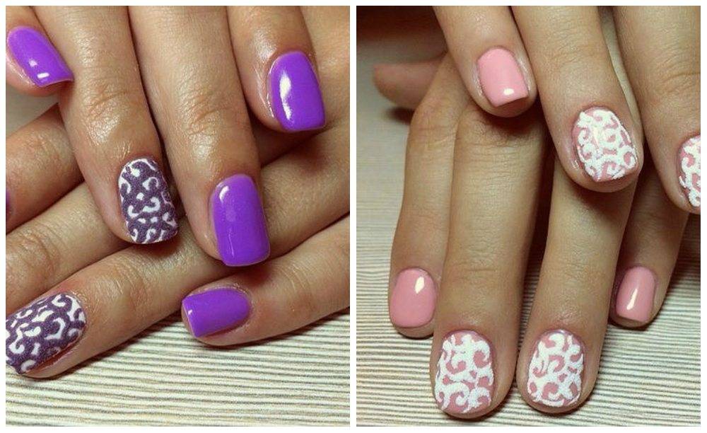- Гель-лаки. Для исполнения самого простого нейл арта достаточно будет одного цвета гель-лака, но если вы хотите, чтобы узор выделялся на ногте, возьмите 2 контрастных оттенка.