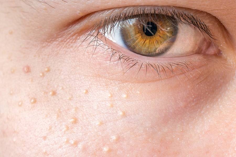 Твердые прыщики также называют «просянкой» из-за внешней схожести с зерном проса. Милиумы — их официальное название в медицинской среде. Локализуются чаще всего на лице в области щек, глаз, подбородка (смотрите фото слева). Реже появляются на коже других частей тела.