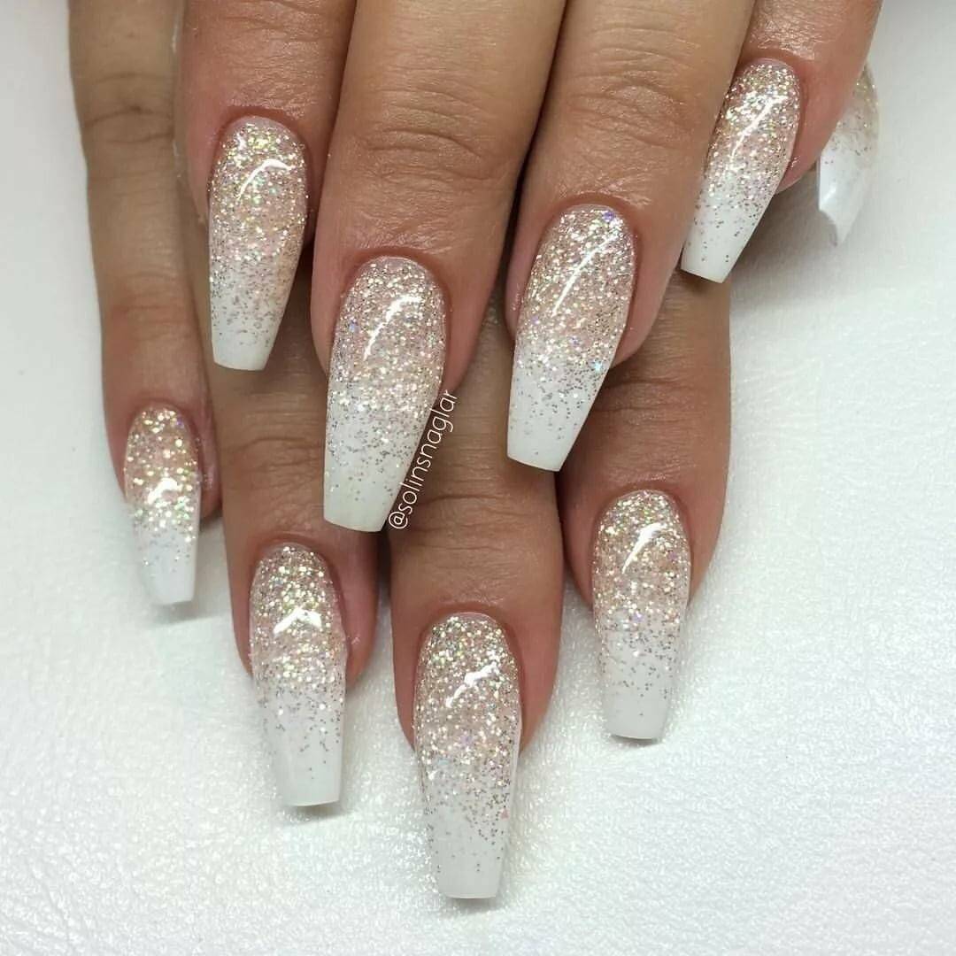 Этот популярный, стильный и красивый прием никогда не утратит своей популярности в сфере нейл-арт индустрии. Известные и модные тенденции делятся на два типа – эффект градиента белого цвета с плавным переходом в блестки, а также растягивание сверкающих блесток на ногтевой пластине, покрытой белым тоном. При этом в любом из вариантов можно использовать блестки разного цвета и формы. Омбре, выполненное при использовании блесток, очень хорошо сочетается с отдельными длинными и острыми ноготками, покрытыми полностью сверкающим декором.