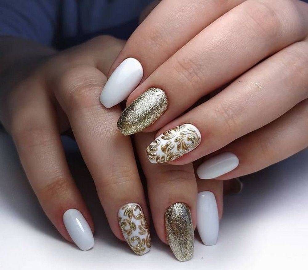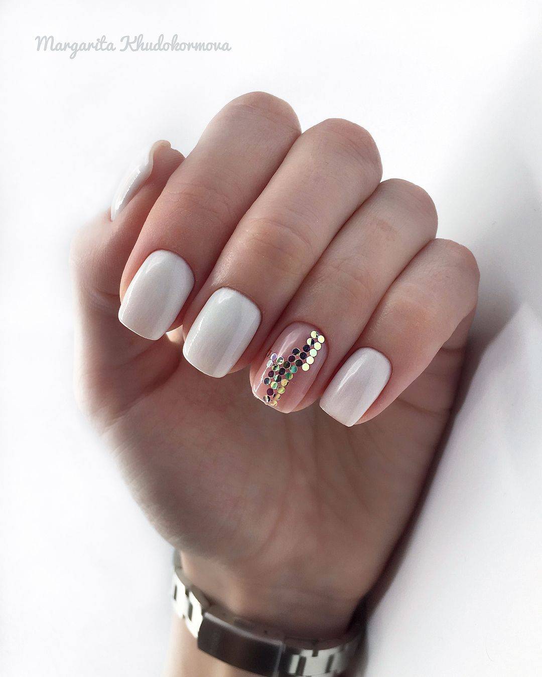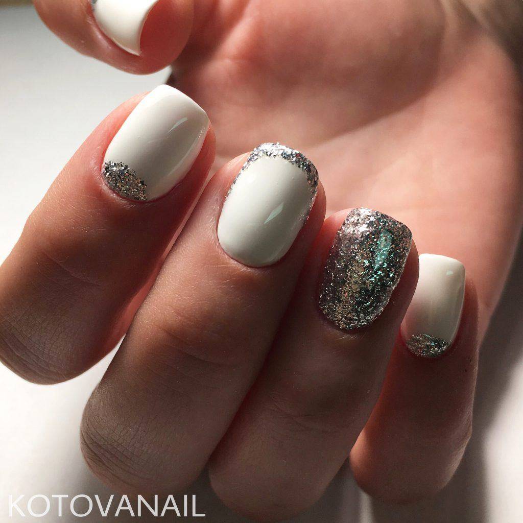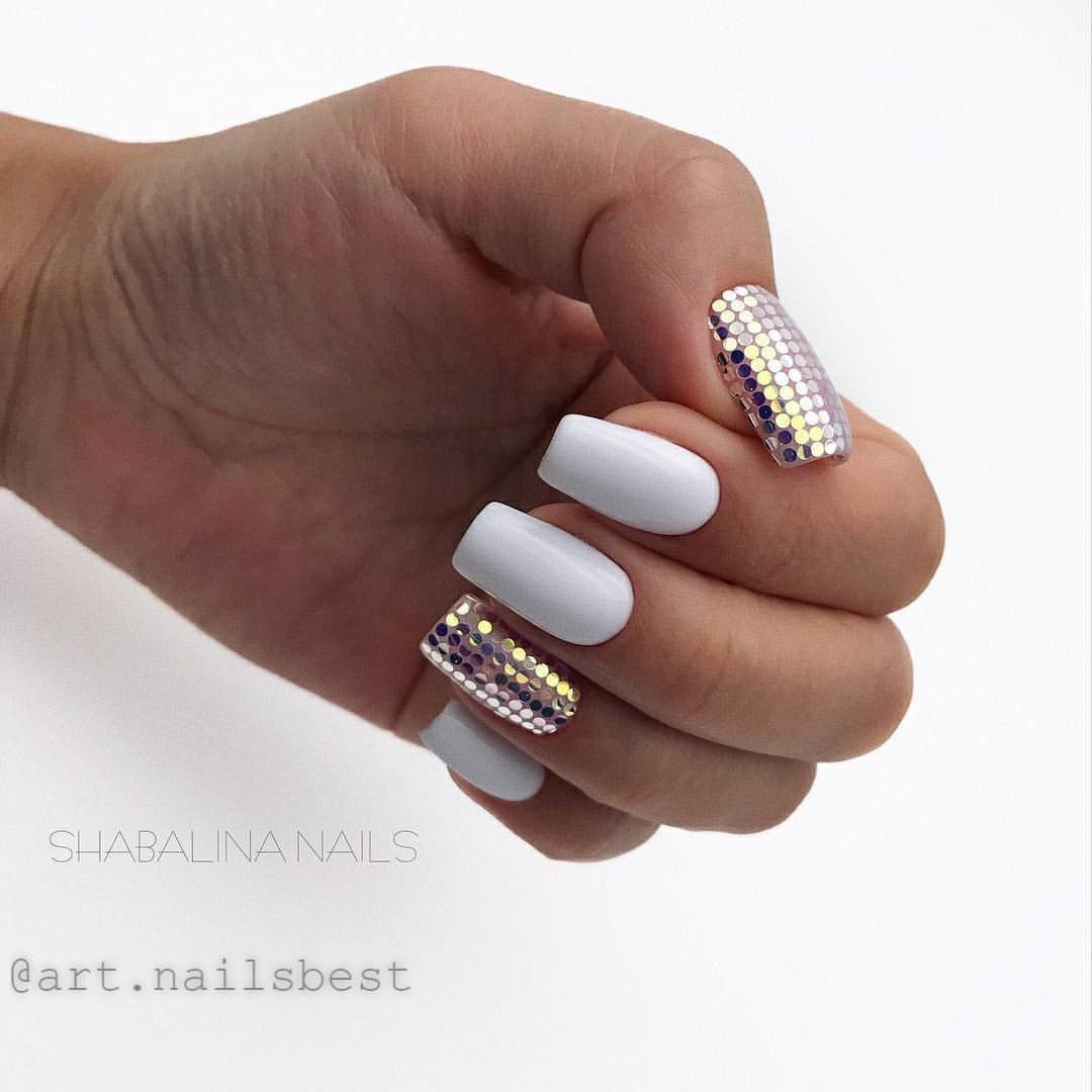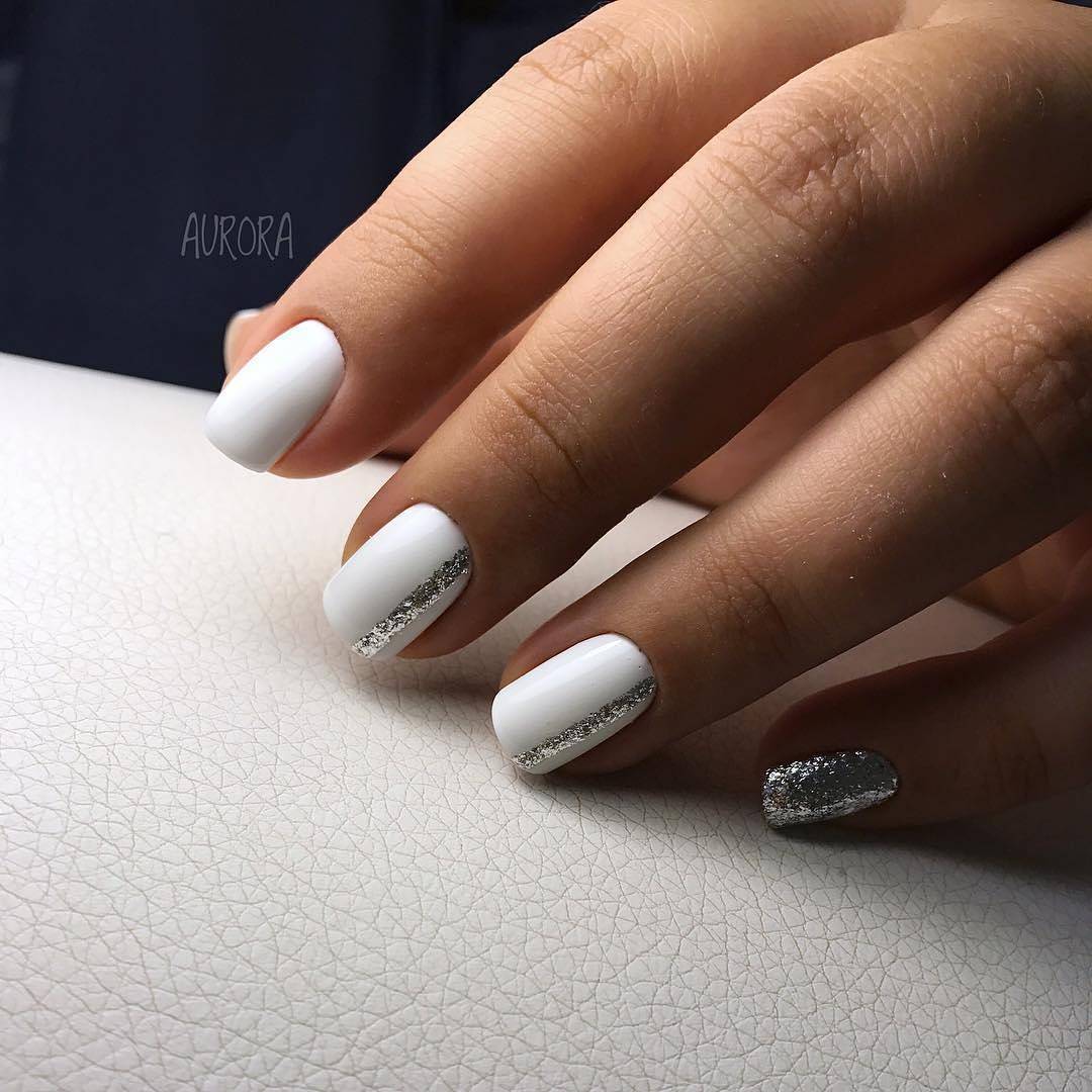 И, конечно, мы не могли не включить в наш мини-рейтинг варианты маникюра, в которых белые ногти украшаются золотыми, серебряными и другими блестящими элементами. Вариантов использования этого тренда может быть масса: от праздничного маникюра в белых тонах и объемными 3D-рисунками до минималистичной блестящей втирки или нежной росписи.