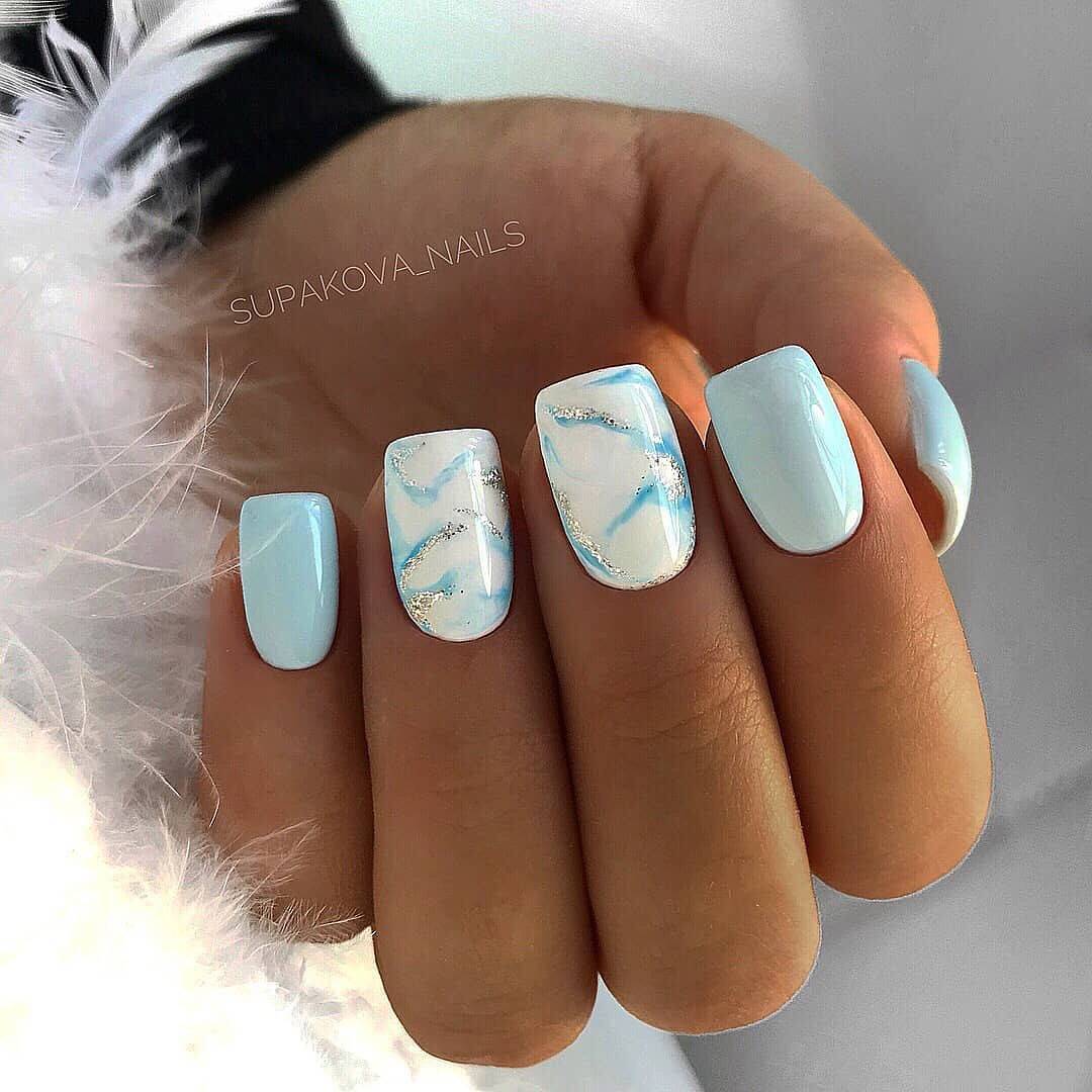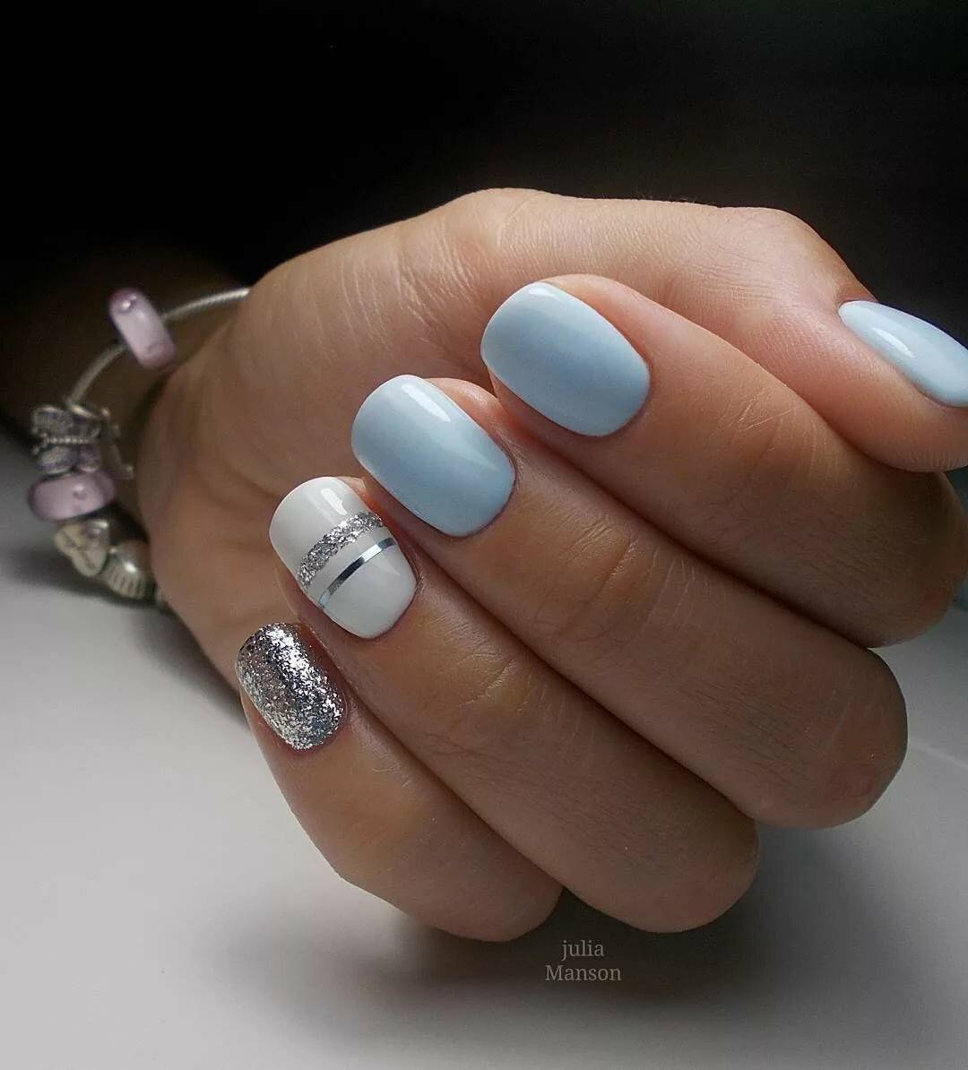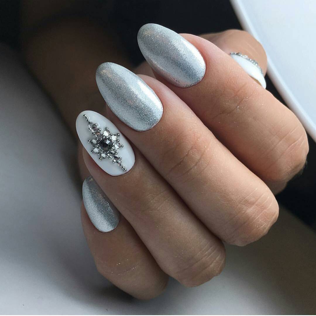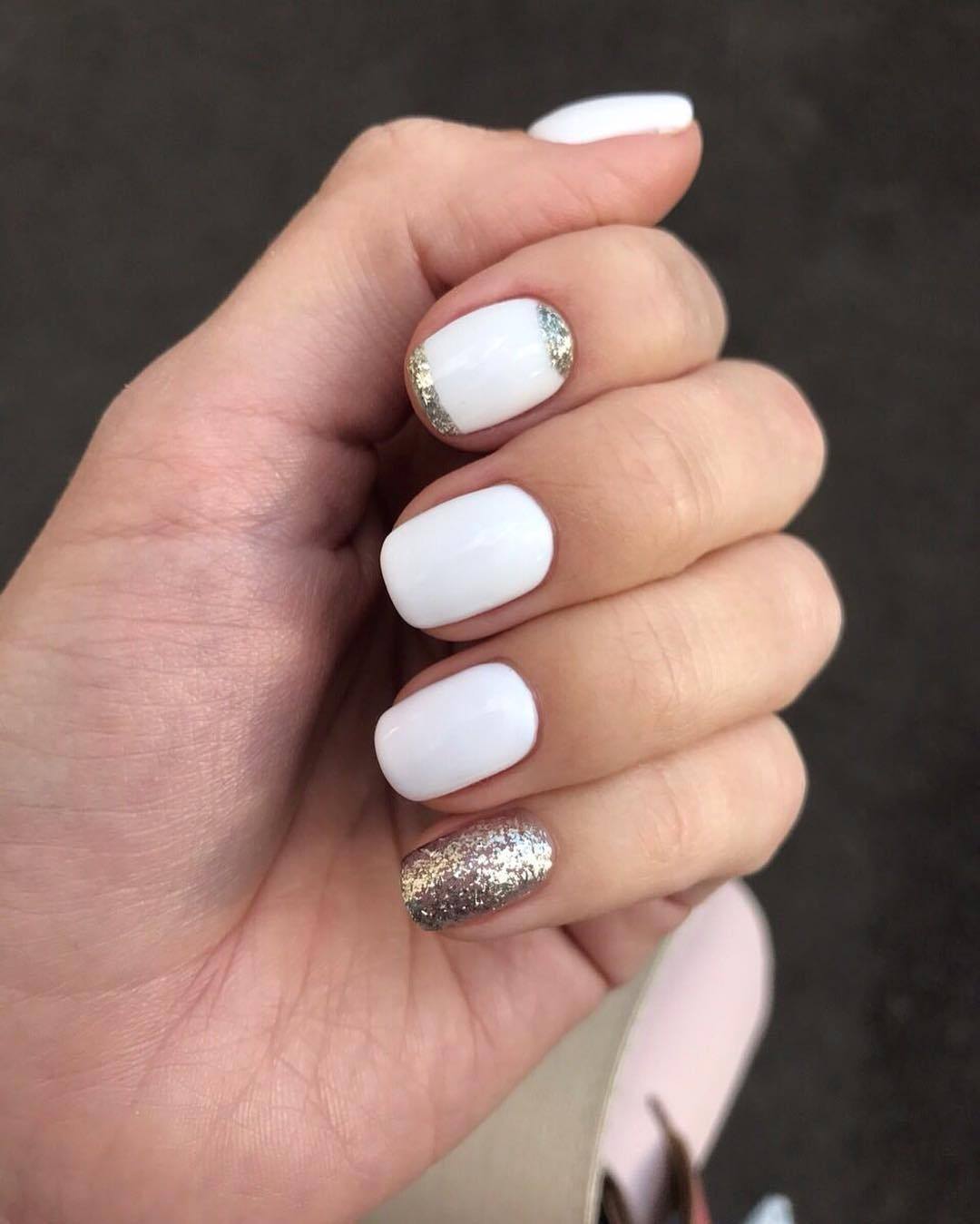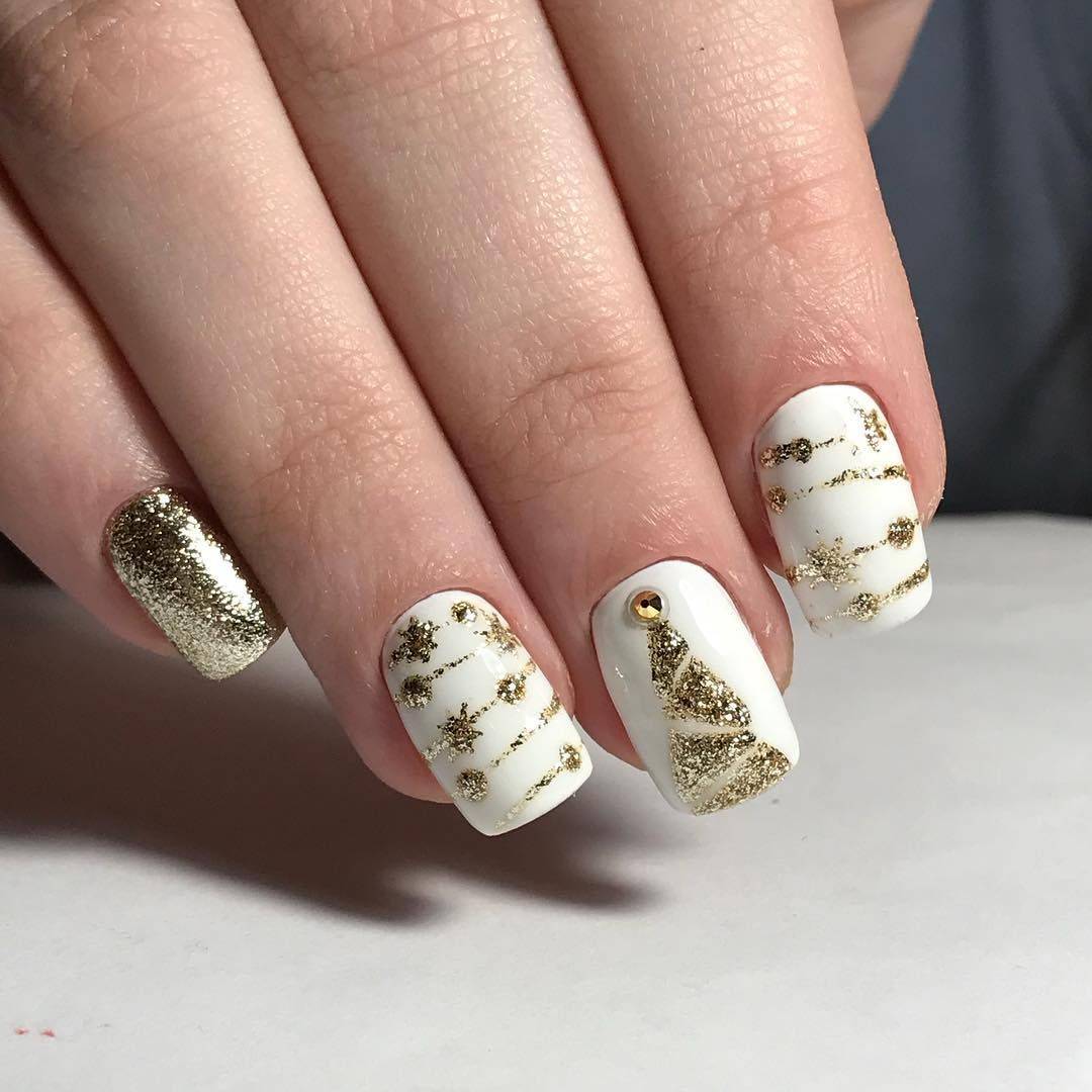 И, конечно, мы не могли не включить в наш мини-рейтинг варианты маникюра, в которых белые ногти украшаются золотыми, серебряными и другими блестящими элементами. Вариантов использования этого тренда может быть масса: от праздничного маникюра в белых тонах и объемными 3D-рисунками до минималистичной блестящей втирки или нежной росписи.