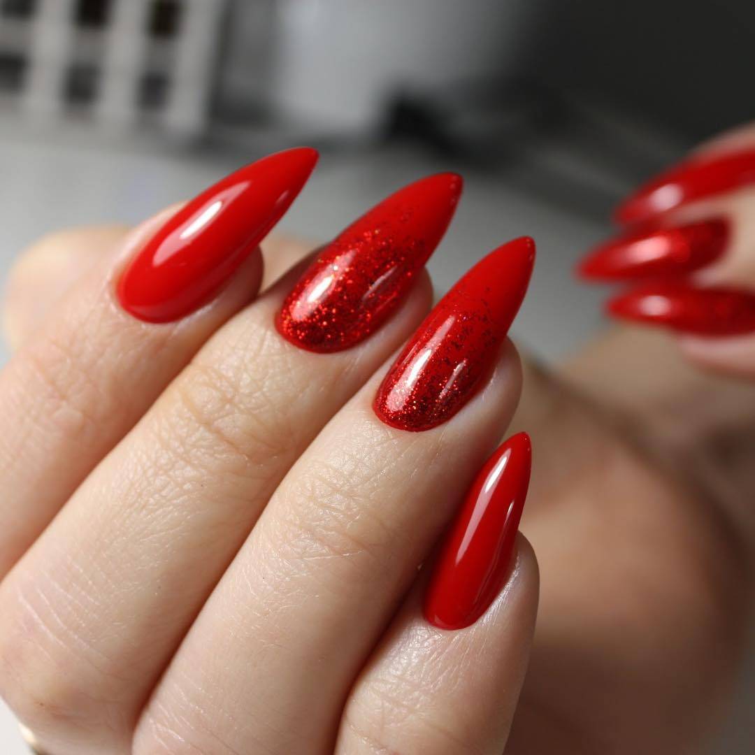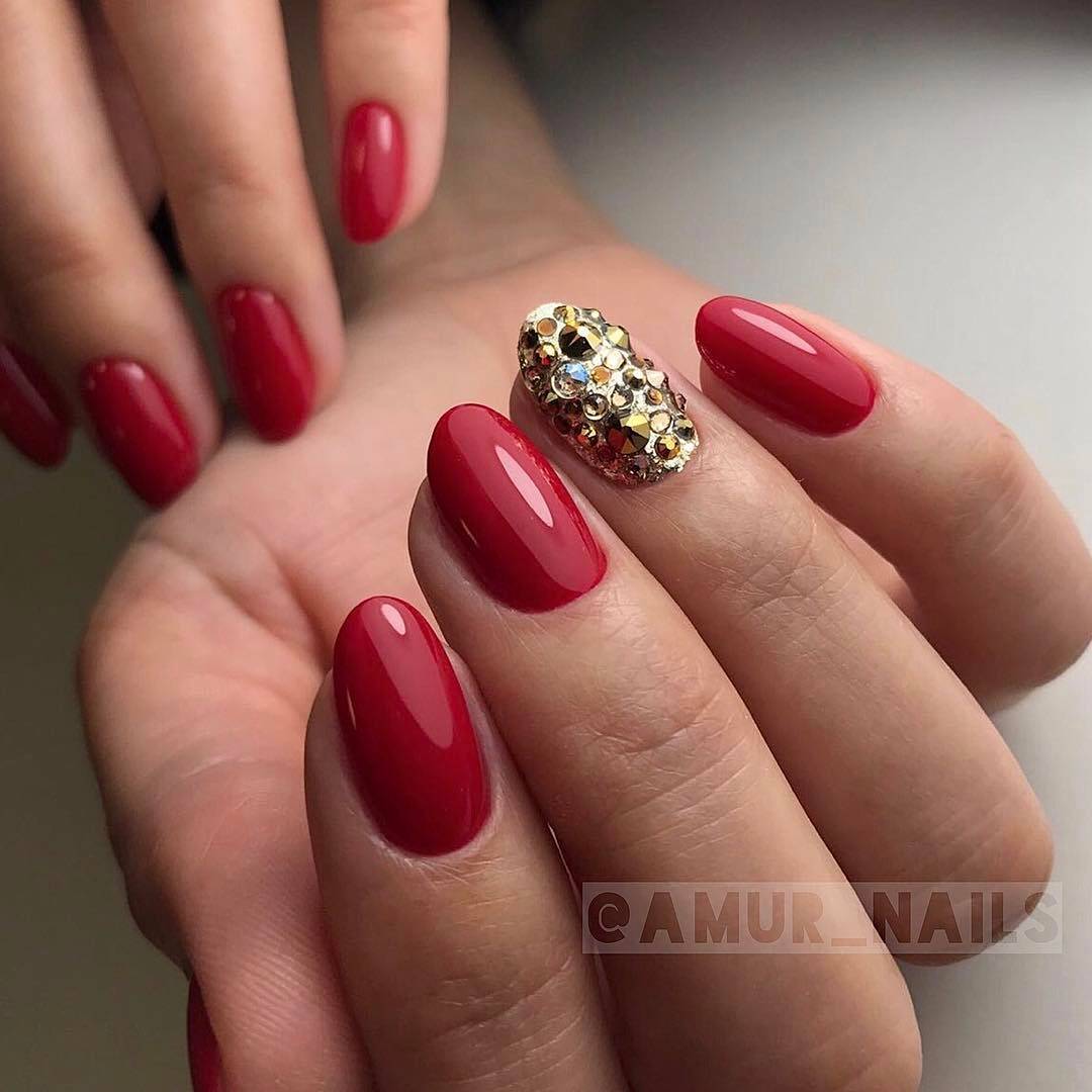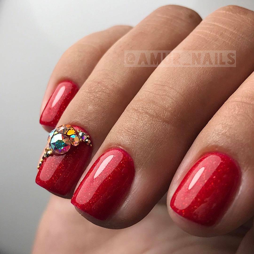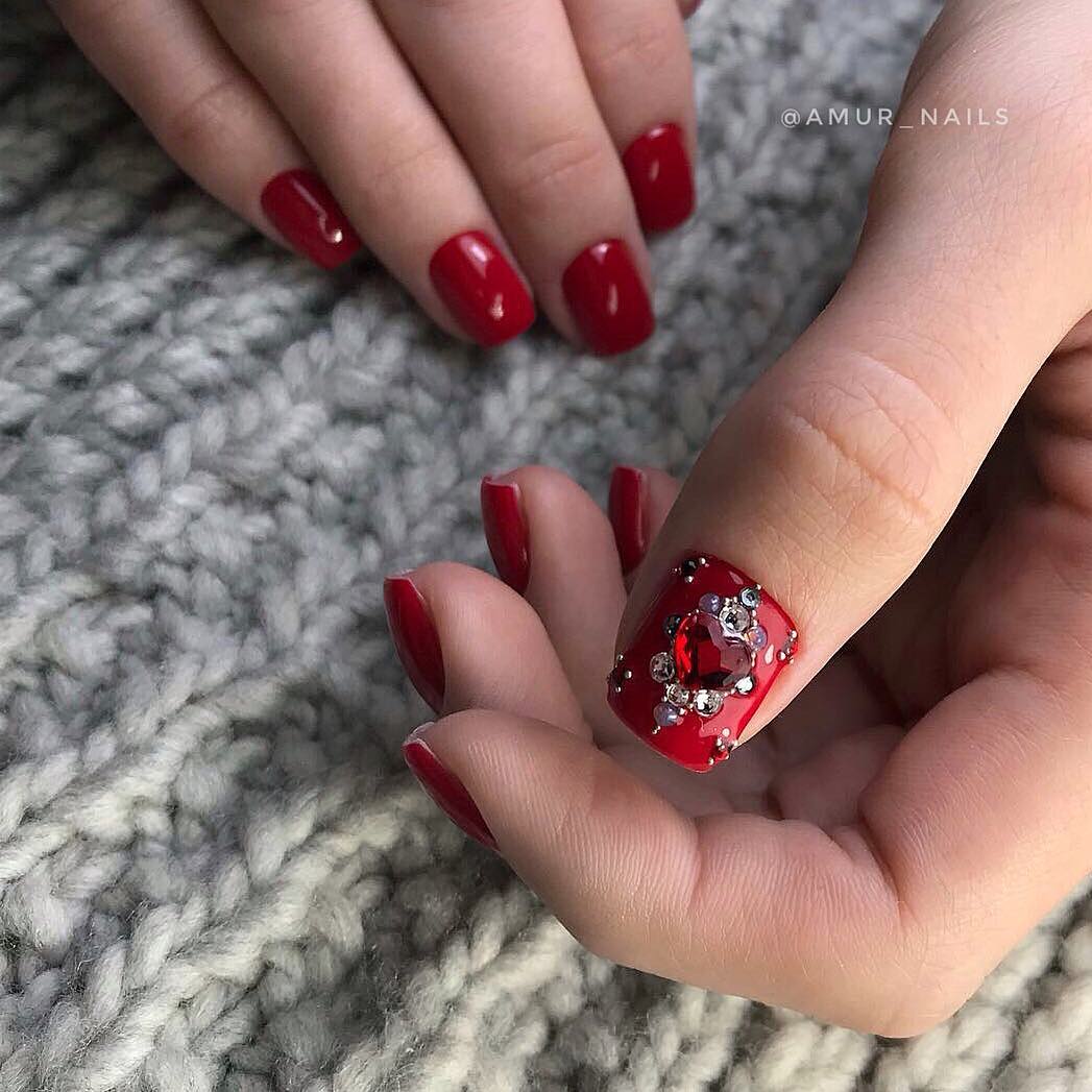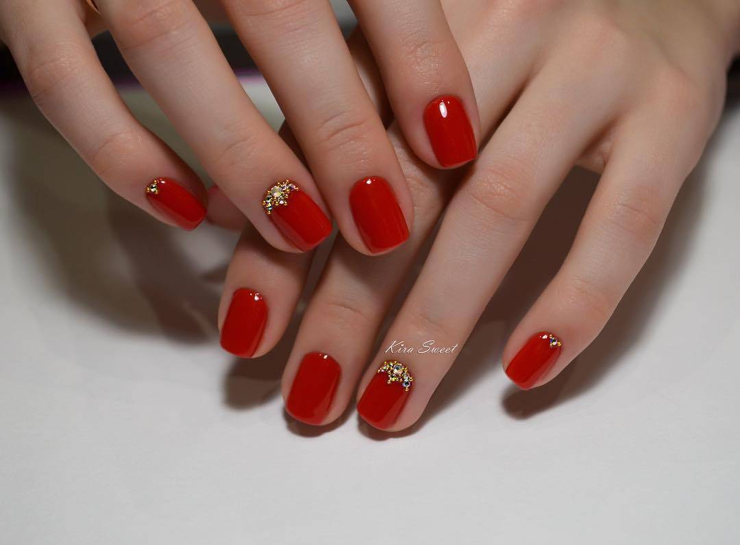 На длинных ногтях красный маникюр смотрится совершенно иначе, чем на коротких. Для создания праздничного маникюра добавьте стразы. Можно отделить ими край ногтя или выложить определенный узор.