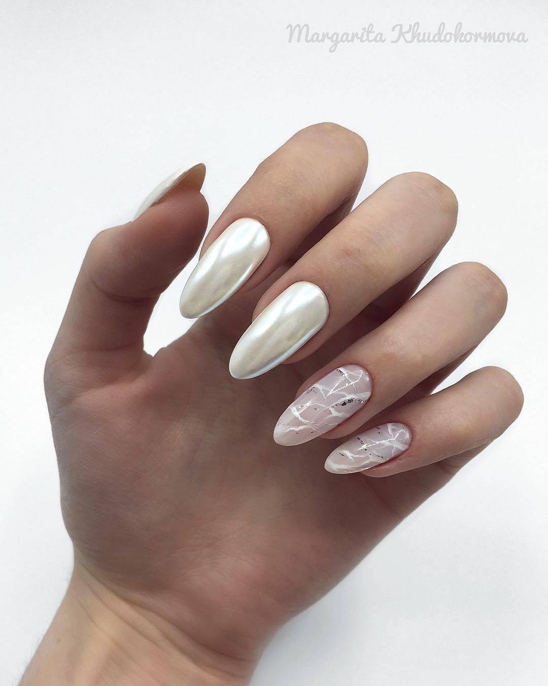 Как прекрасный и дорогой жемчуг будет смотреться Ваш миндальный маникюр со стразами, если в качестве основы ногтевую пластину покрыть светлым тоном нежно-розового гель-лака с применением блестящей пудры, известной под названием «втирка». Миндальный маникюр с использованием мраморной техники в светлых оттенках, созда неповторимые, уникальные дизайны ногтей.