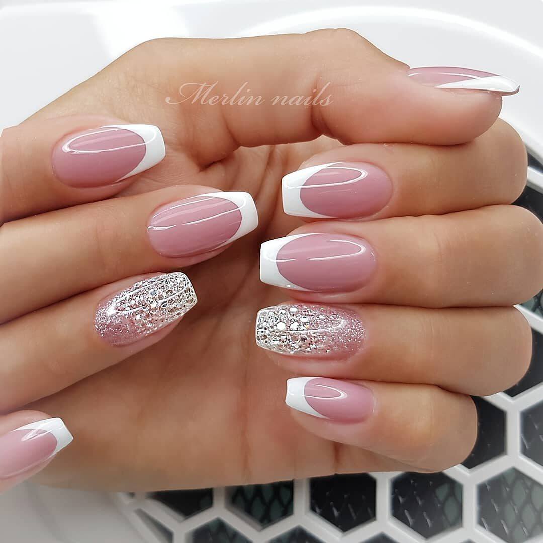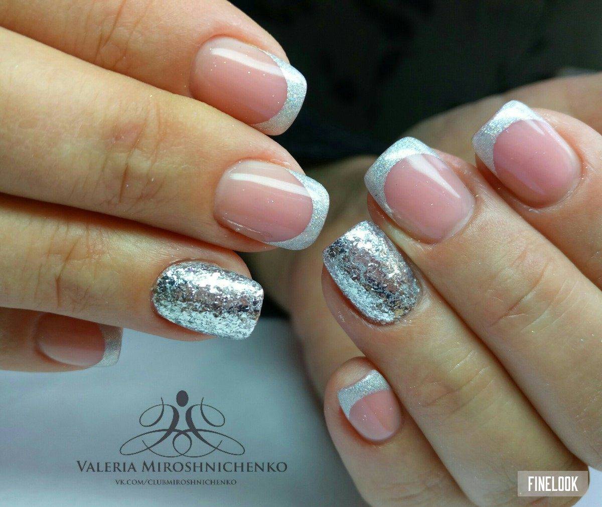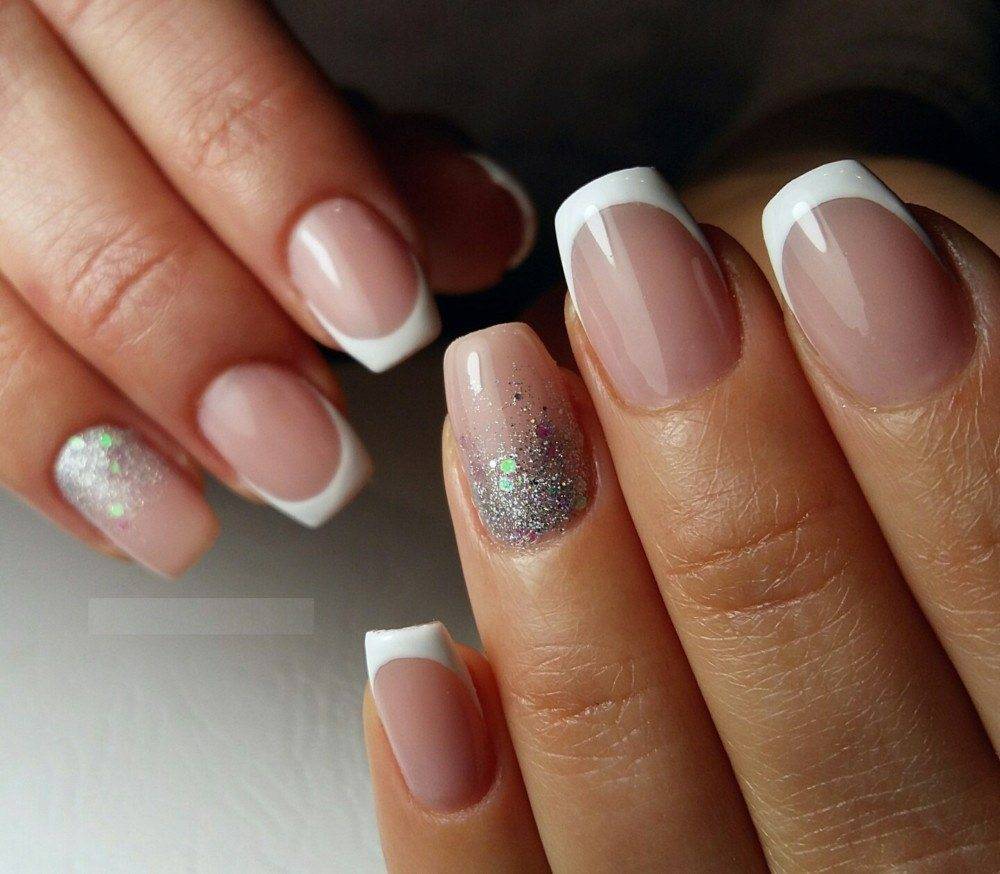 Французский маникюр с применением белого цвета и мерцающих акцентов – это главные составляющие очаровательного и превосходного нейл-арта. С таким маникюром можно легко экспериментировать и получать сногсшибательный эффект. Универсальность французского маникюра «шагает в ногу» с современными тенденциями модной одежды. Самым лучшим вариантом станет белая основа с блестящей улыбкой разной формы. Данный прием удивительно утонченно выглядит на ноготках любой длины. Можете смело применять как цветные, так и металлические блестки. Еще одна модная тенденция сферы нейл-арта – сочетание сверкающего и однотонного покрытия в одном дизайне.