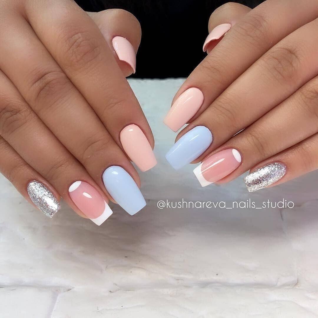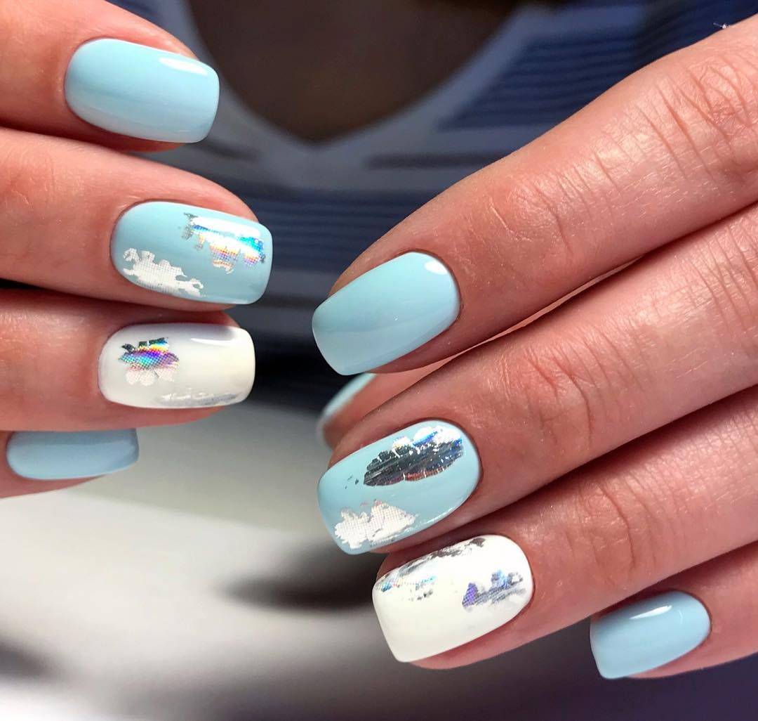 Приглушенные оттенки синего гармонично сочетаются с любым оттенком лилового, яркие тона стоит подбирать аккуратно, чтобы избежать эффекта «забивания» цветов друг другом. Голубые пастельные тона удачно смотрятся с лиловыми оттенками, объединяясь в эффектный геометрический маникюр, френч, точечный дизайн и т.п.