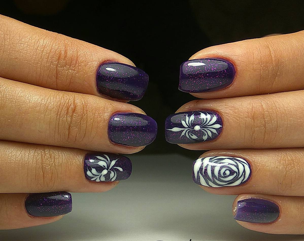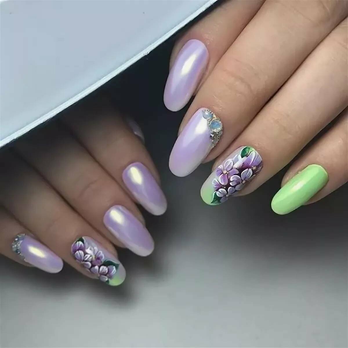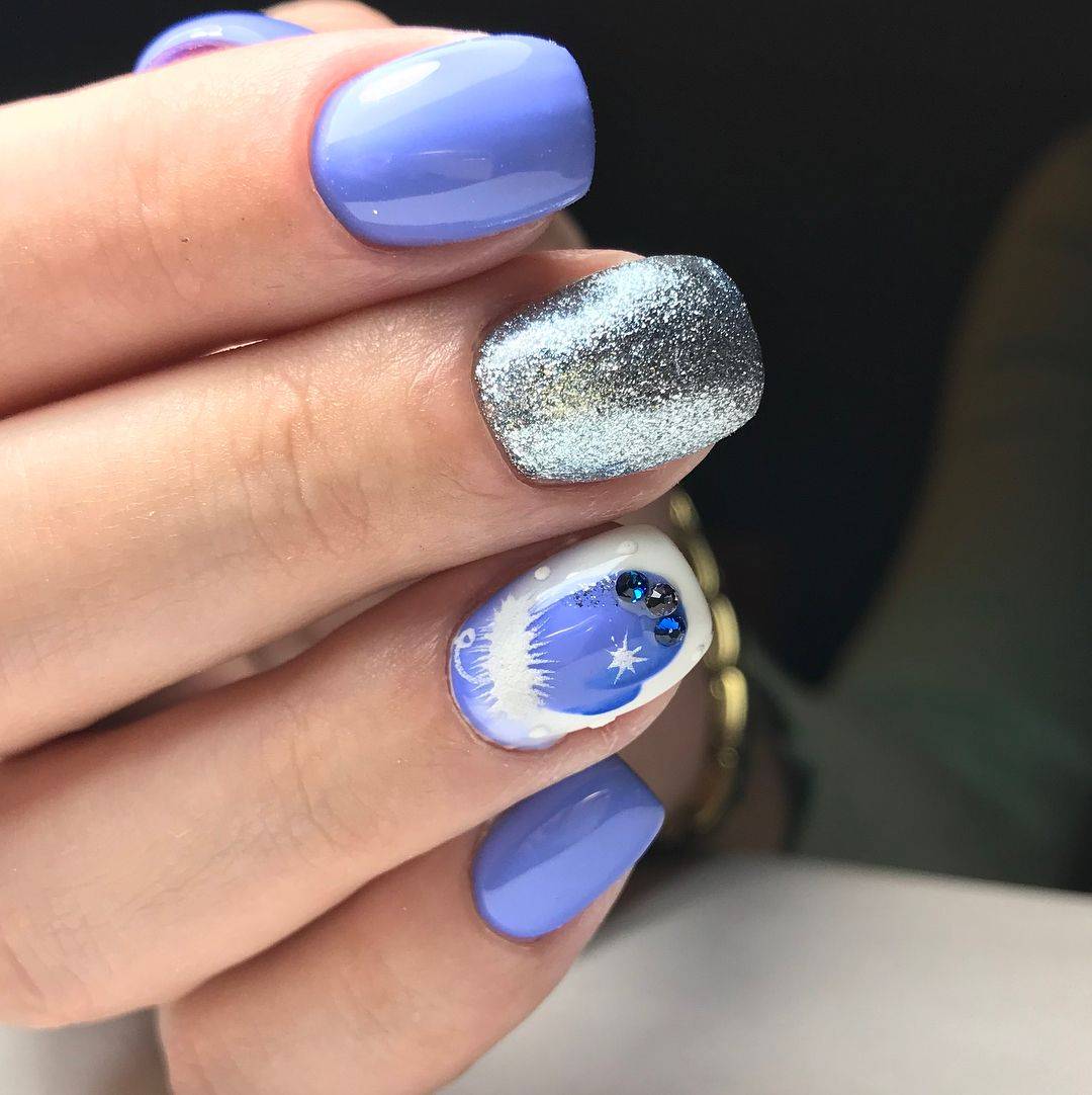Светлые оттенки сиреневого отлично объединяются с белым цветом в таких техниках: френч, лунный маникюр, лунный френч, геометрия и т.д. Небольшое количество декора (стразы, блесточки, фольгированная лента) добавляют нейл-арту индивидуальности, не отягощая его. Для праздничного или вечернего маникюра можно выбирать более смелые оттенки фиолетового и большее количество декора.