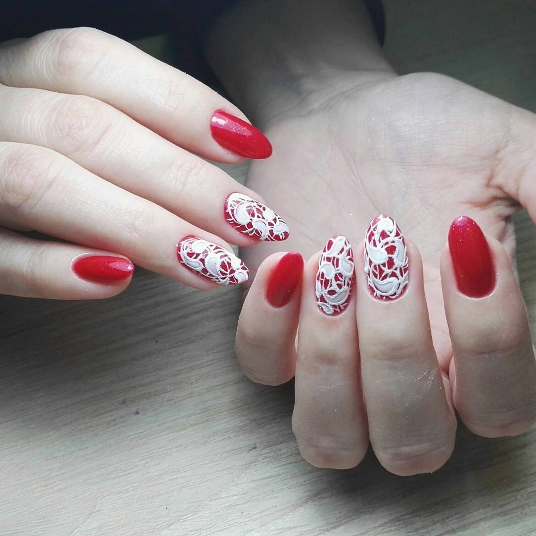 Красно-белый дизайн на длинных ноготках смотрится без преувеличения великолепно. Яркость красного изящно сдерживается лёгкостью белого, что позволяет в подобном дуэте оформлять не только праздничный, но и повседневный маникюр. В коллекции трендовых идей продольные линии, мраморные ноготки, оригинальные рисунки и множество примеров с элементами декорирования. Красный и белый лаки могут чередоваться на пальчиках или красиво сочетаться на одном ноготке. Для дополнения дизайна блестящими нотками прекрасным выбором станет золотистая фольга, которая часто выступает в качестве подложки для рисунков, глиттер, разноцветные конфетти, стразы и металлизированные полосочки.