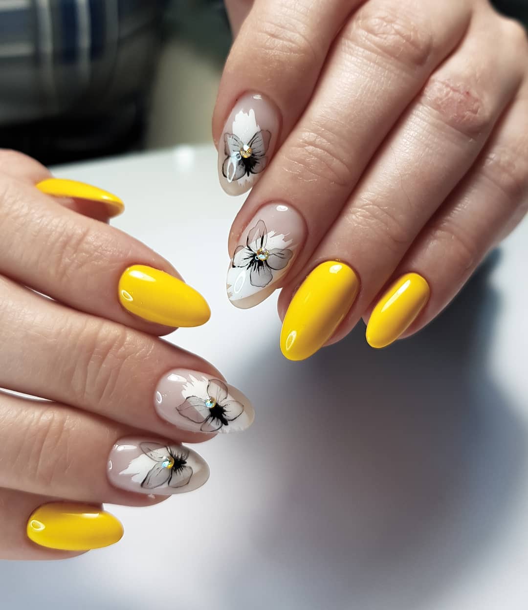 - Если ваши ногти круглой или овальной формы, то лучше отдать предпочтение цветочному или тропическому принту. В случае с квадратными ногтями, идеальным вариантом станет геометрический узор.
