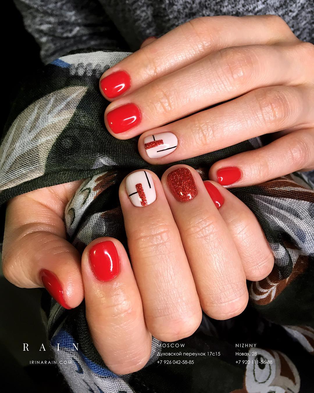 Но помимо праздничных мотивов, такое сочетание может выглядеть очень стильно и в обычный день — все зависит от того, как комбинировать цвета. Ниже мы подобрали несколько идей маникюра с белым гель лаком и красными вкраплениями — как к праздникам, так и на повседневную основу.