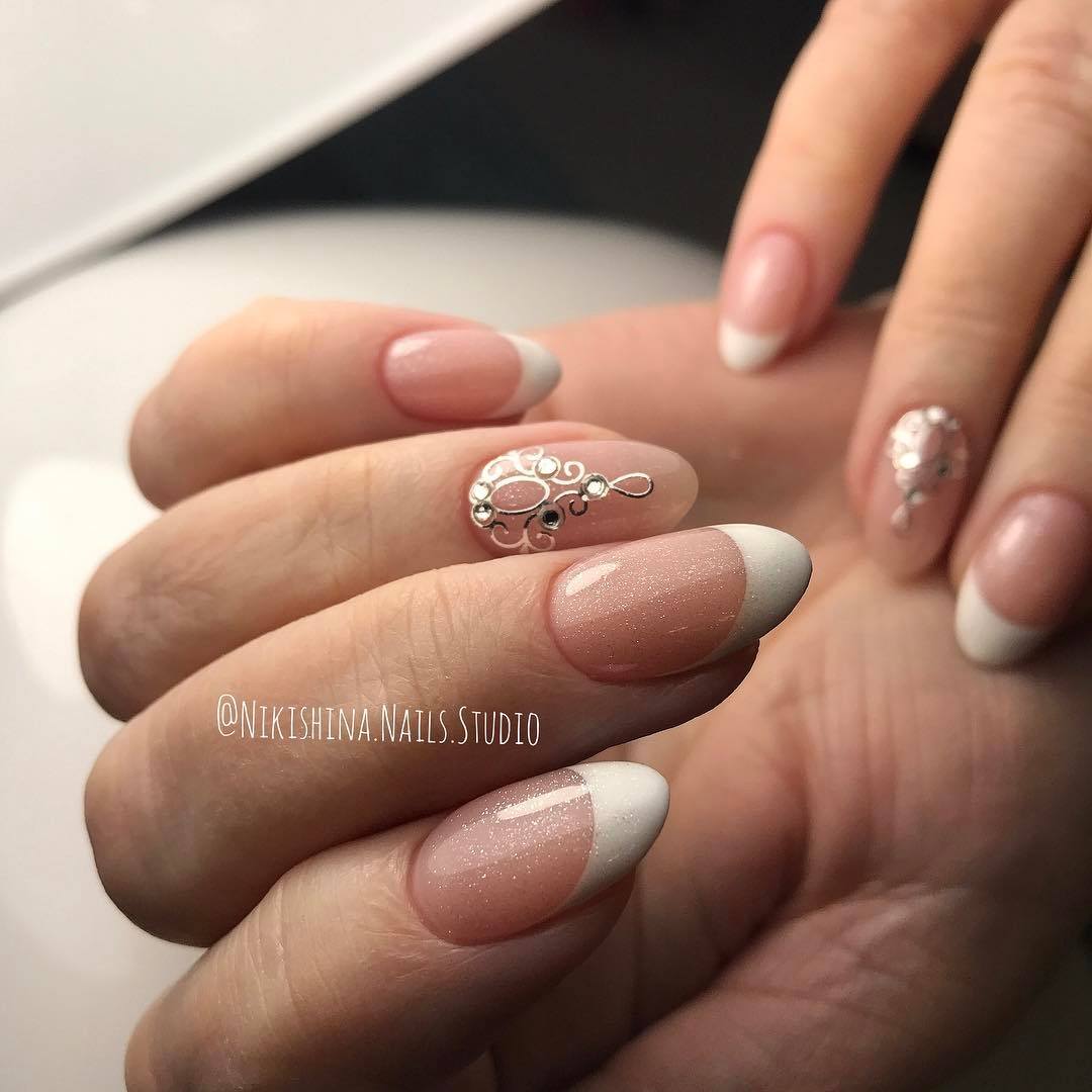 Ноготки белого цвета считаются бессменным хитом нейл-дизайна, ведь не смотря на свою простоту и лаконичность, белый лак не только шикарно смотрится на ноготках, но и считается универсальной основой для декорирования. На ногтевых пластинах миндалевидной формы белый маникюр смотрится особенно красиво и предлагает модницам массу идей дизайна с использованием блёсток, которые идеально впишутся как в повседневный, так и праздничный образ. Особенно привлекают такие решения барышень, собирающихся под венец. Модный миндалевидный маникюр с белым лаком и блёстками — это в первую очередь однотонный нейл-арт с блестящим акцентом на паре ноготков и классических френч с блестящей прорисовкой улыбки. А также различные полоски, рисунки и композиции из мелких блестящих частиц, бусин и камней. Главное – не увлекаться количеством элементов декора. Минимализм в этом случае считается залогом успешного нейл-арта.