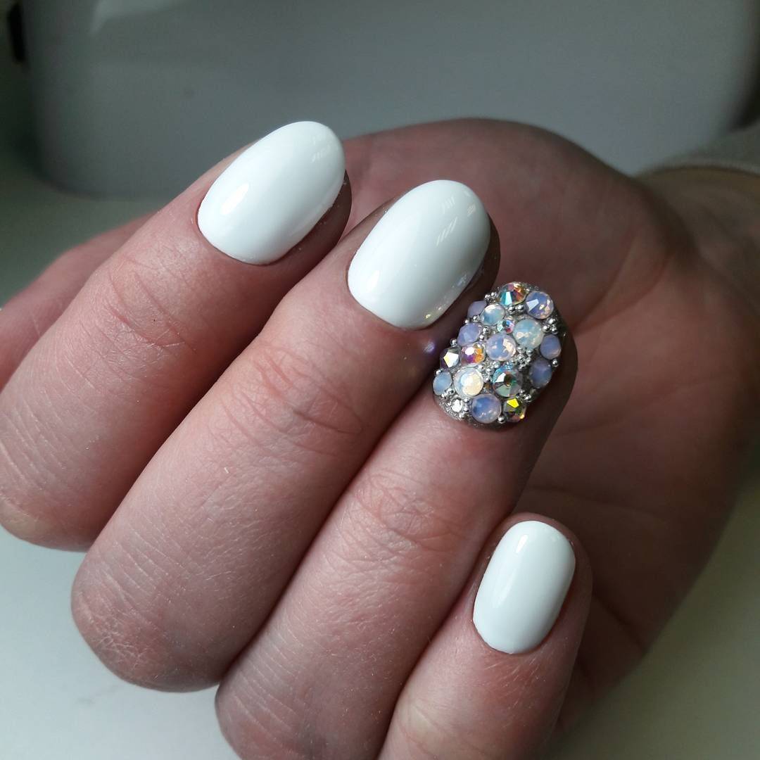 Однотонное покрытие пользуется большой популярностью у девушек. Часто покрытие дополняют минималистичным декором, блестками, глиттером или втиркой. Самый оригинальный вариант дизайна – это однотонное покрытие белым гель-лаком с выделением 1-2 ноготков сплошным блестящим слоем.