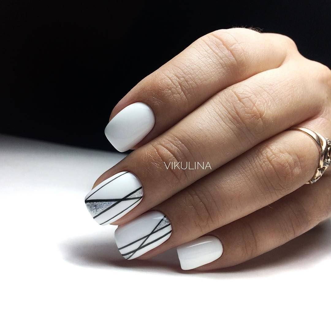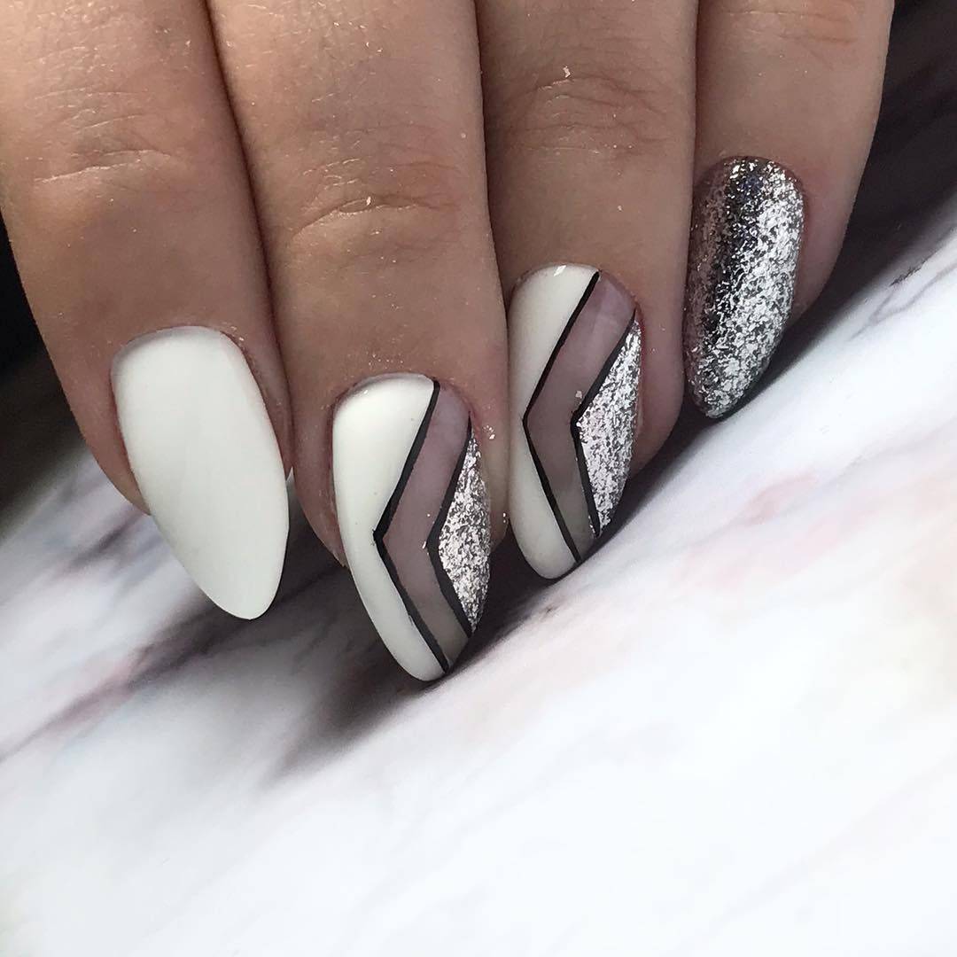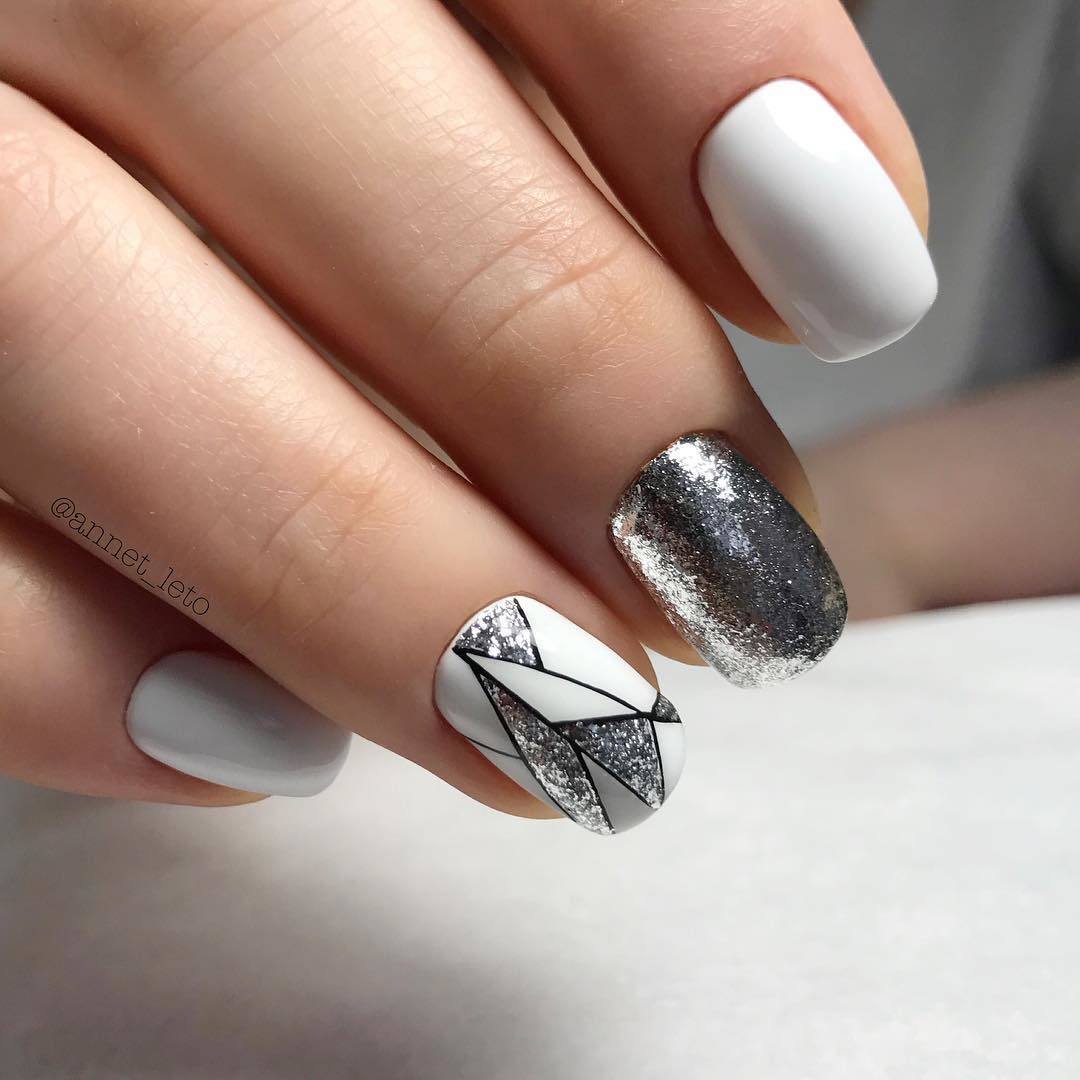 Черно-белый маникюр смотрится насыщенно и очень заметно, поэтому выполнять его лучше качественными гель-лаками и у профессионального мастера. В качестве альтернативы белому цвету можно использовать серебряный глиттер. Он смотрится торжественно и красиво, отлично впишется как в повседневный, так и в торжественный образ.