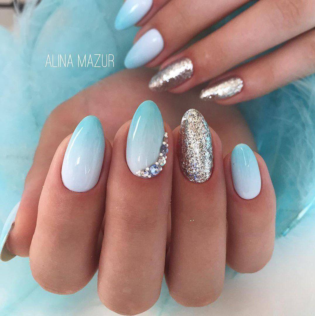 Эффектный и привлекающий внимание дизайн – омбре или градиент в светлых оттенках, который просто великолепно смотрится на миндалевидной форме ногтей
