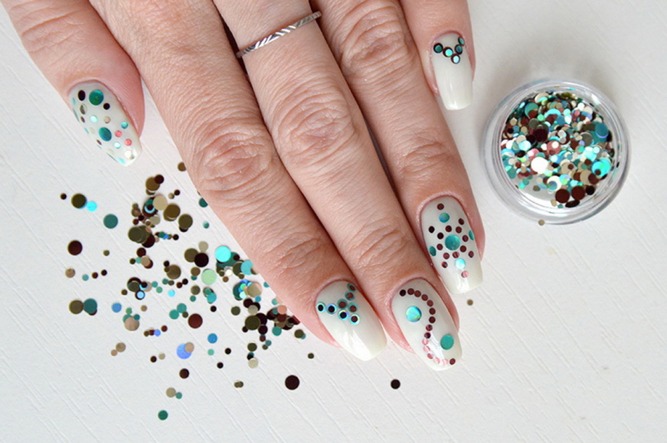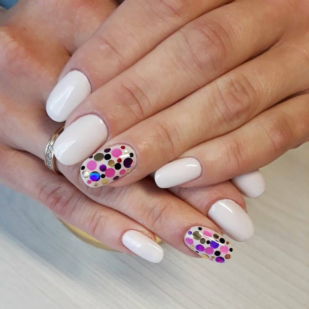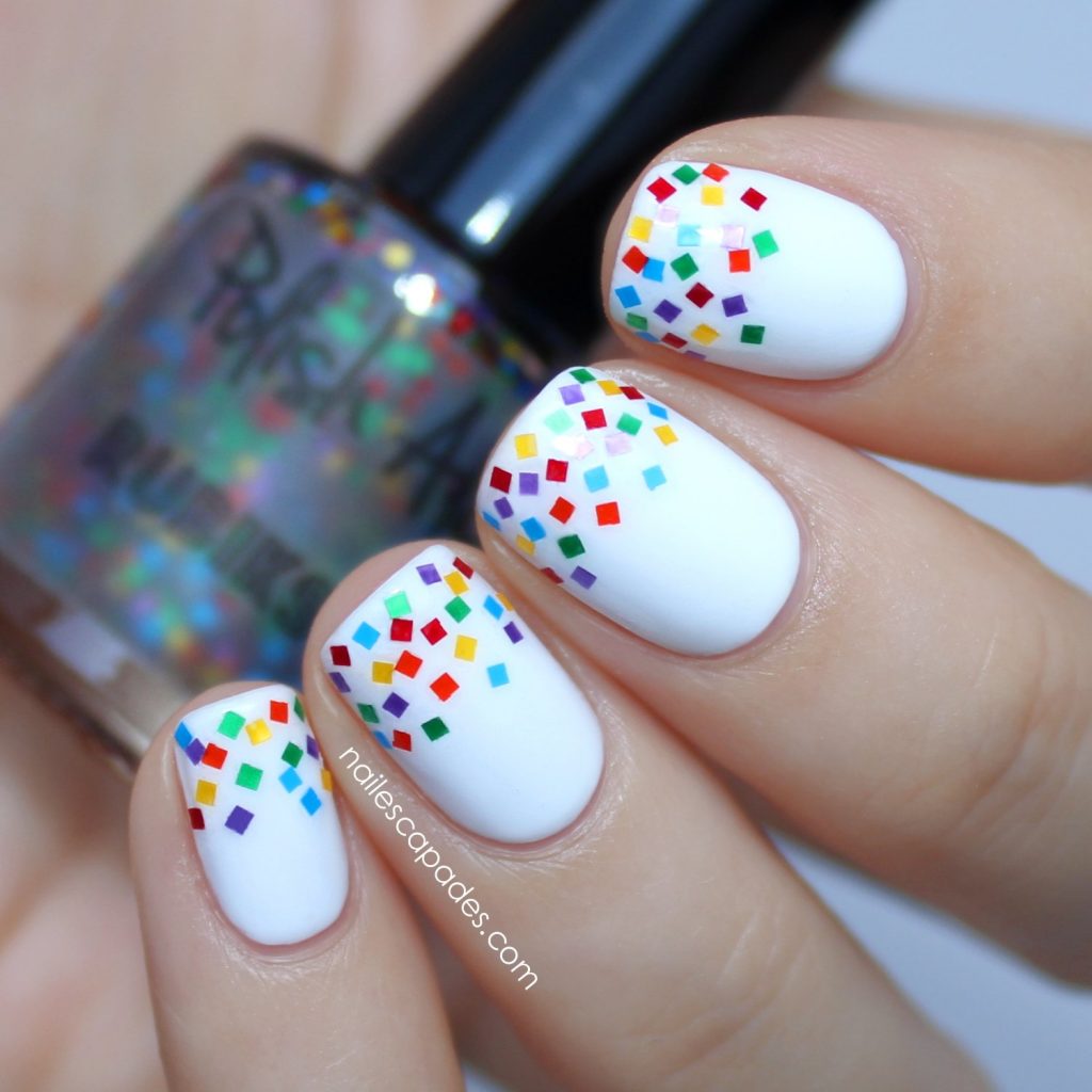 Цветные конфетти на белоснежный фон выкладывайте поштучно. Сделайте смелый шаг и задекорируйте с помощью конфетти весь ноготь