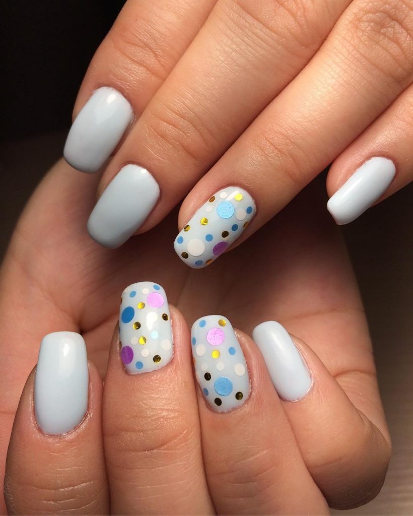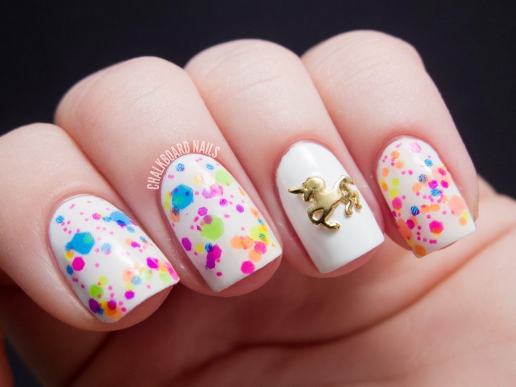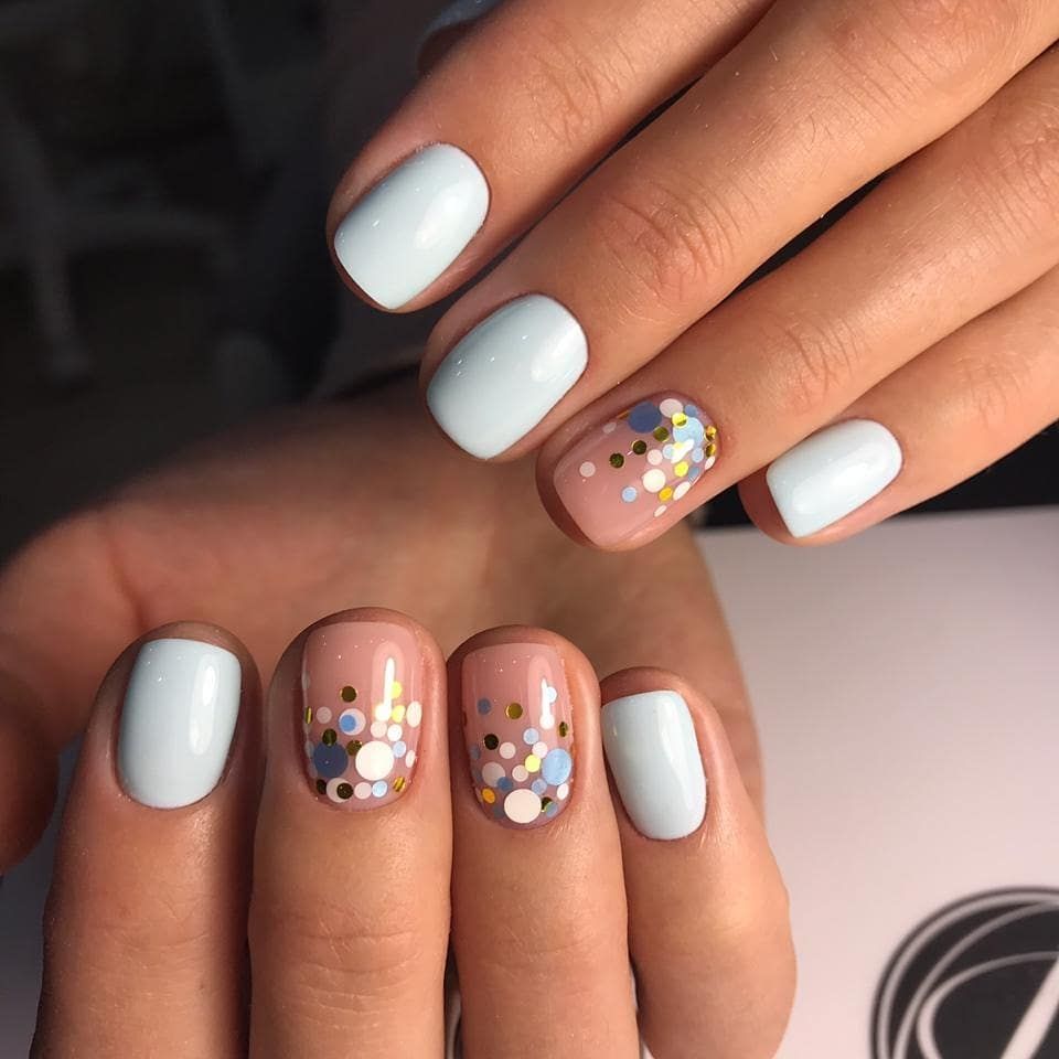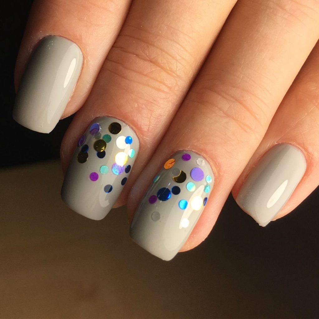 Цветные конфетти на белоснежный фон выкладывайте поштучно. Сделайте смелый шаг и задекорируйте с помощью конфетти весь ноготь