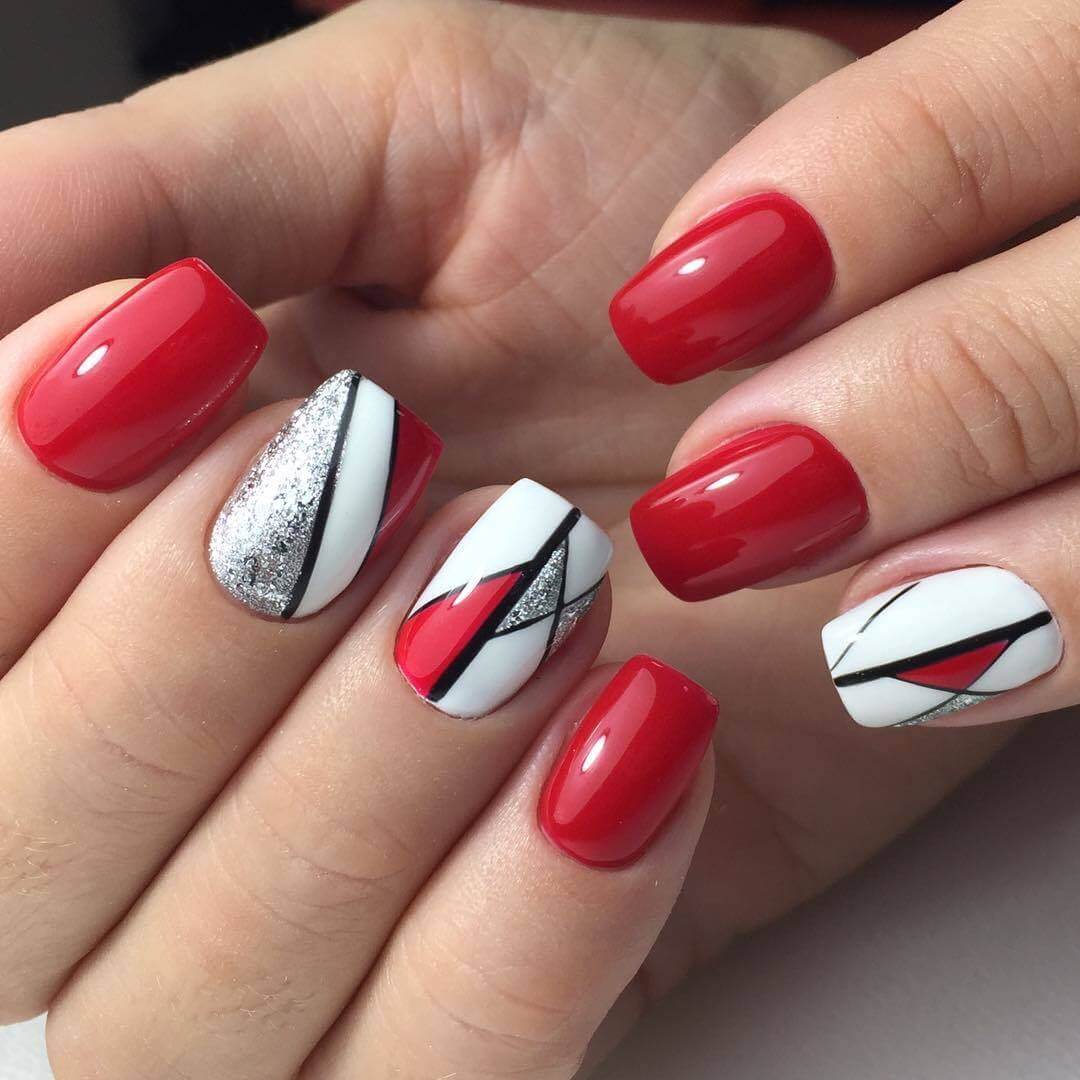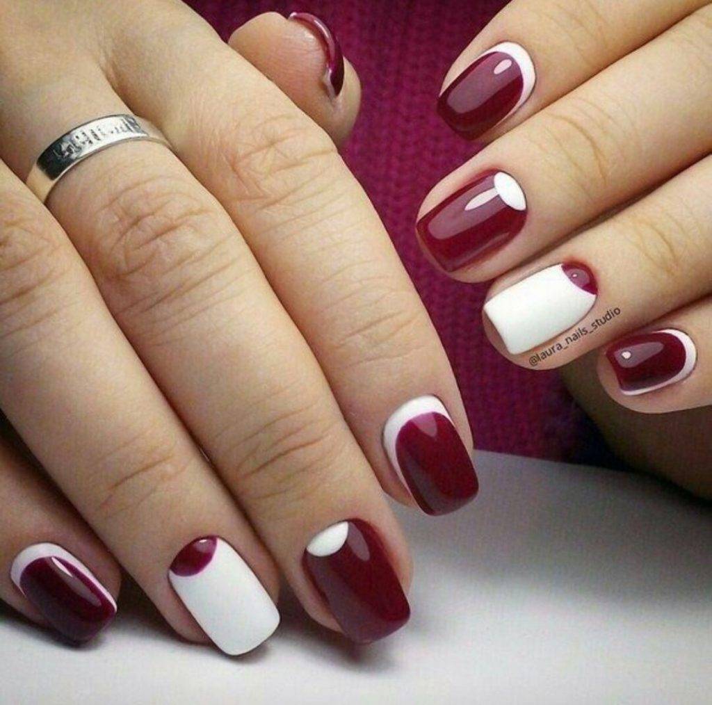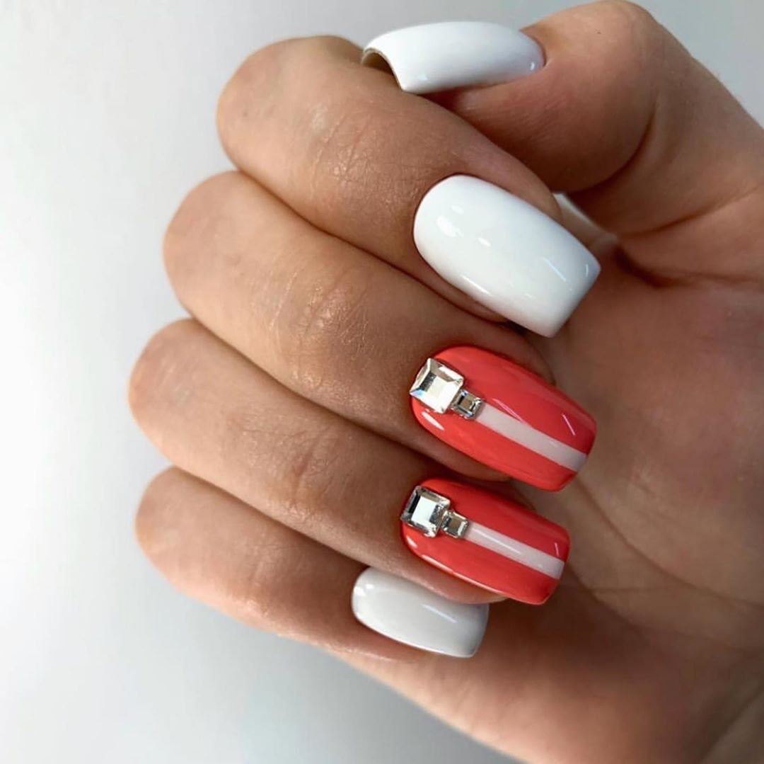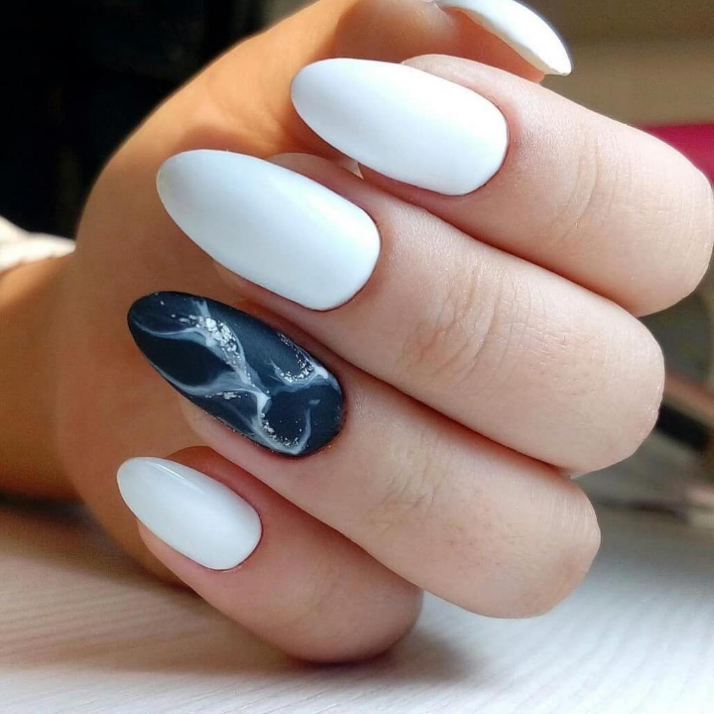 В основном, для маникюра выбирают два цвета, которые гармонично дополняют друг друга. В данном случае базовым будет белый лак. А дополнить его можно самыми разными вариантами. Популярностью пользуется классическое решение в виде черно-белого маникюра. Смотрится он достаточно активно, эффектно и уж точно не останется без внимания. В основном в выбранном цветовом решении выполняют мраморный, геометрический или абстрактный дизайн. Не менее эффектно смотрится красно-белый маникюр. Это беспроигрышное сочетание, которое вмиг преображает любое оформление. Чаще всего можно увидеть красно-белый лунный маникюр или же с различными праздничными деталями.