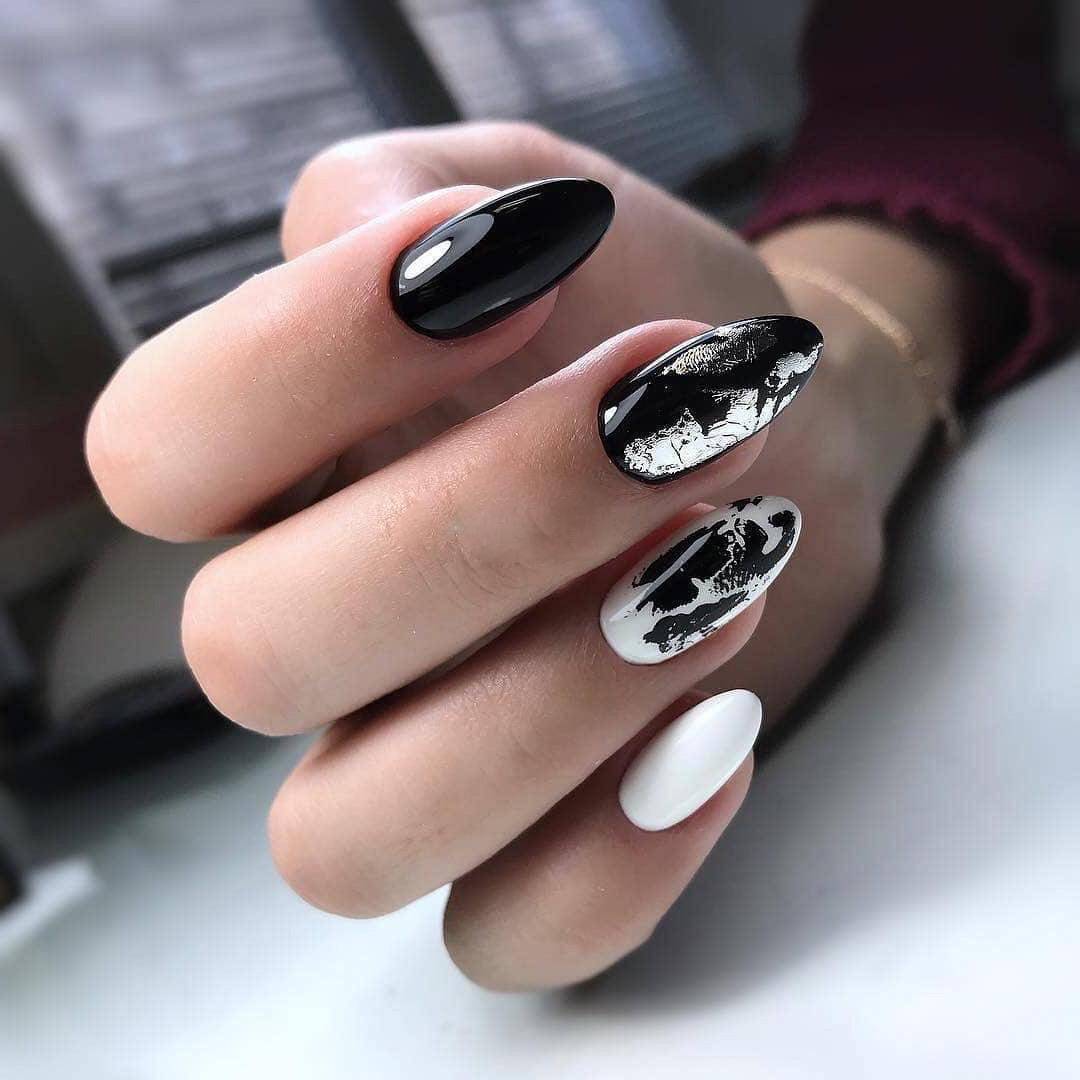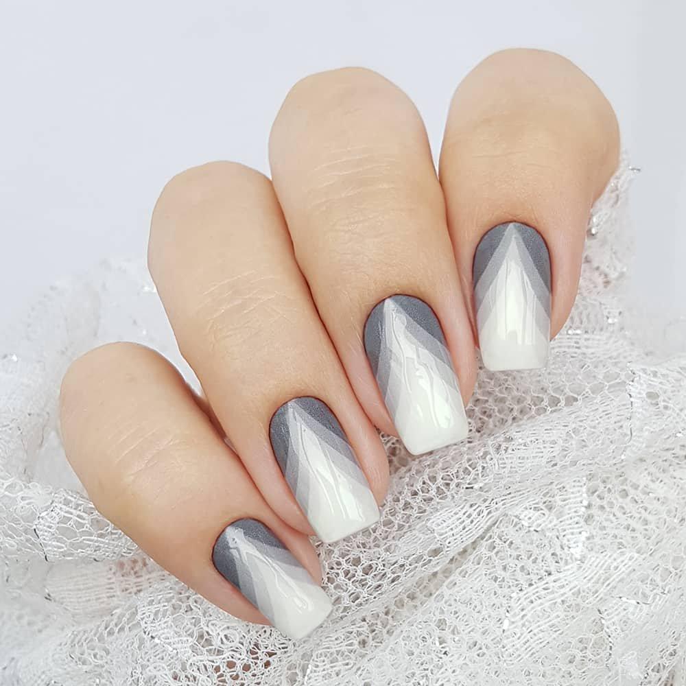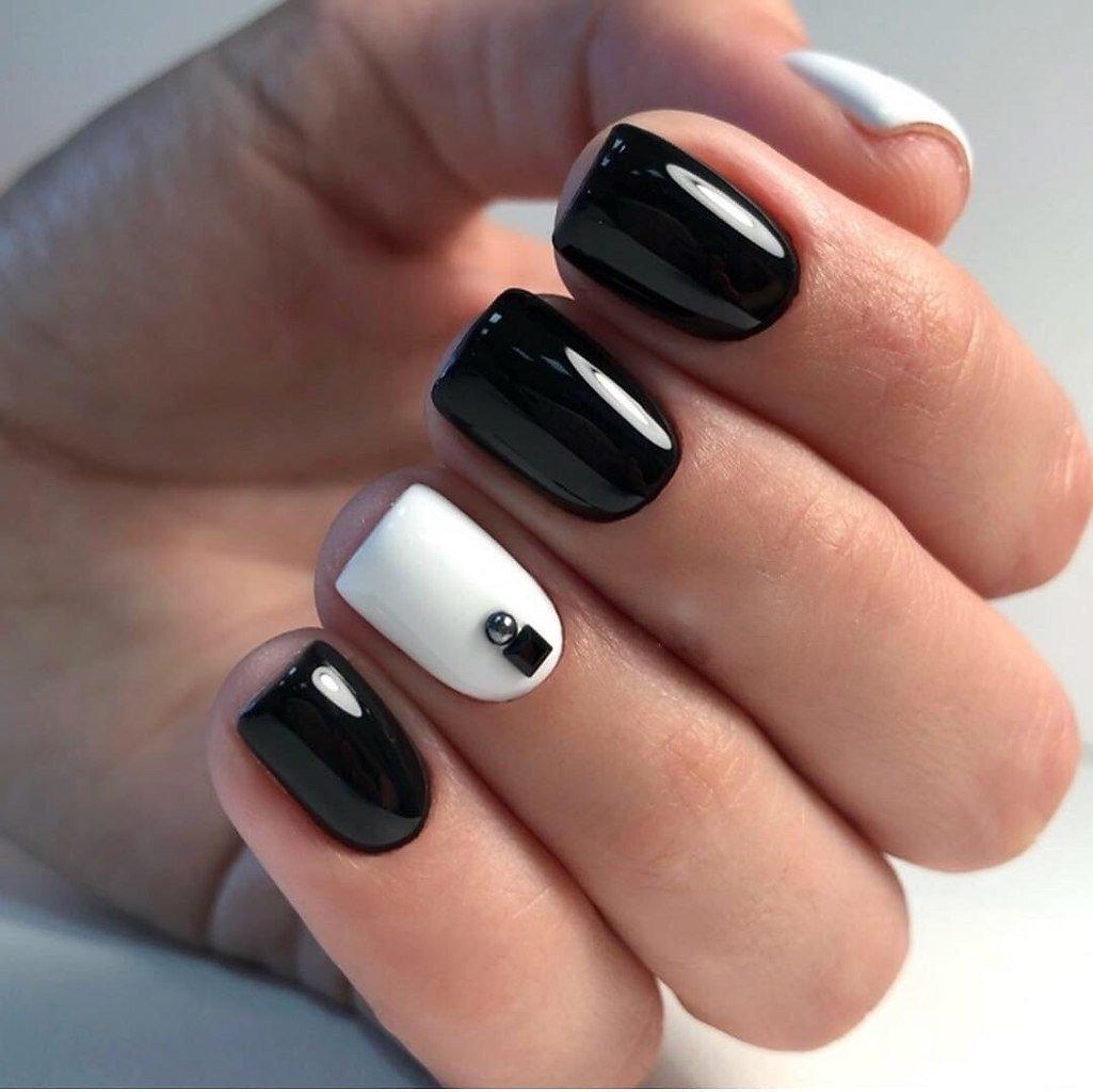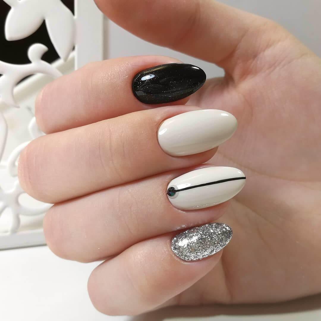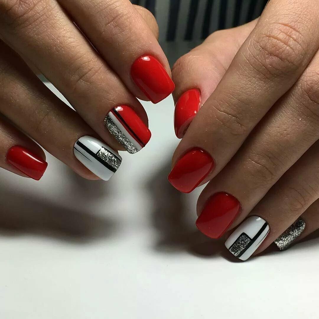 В основном, для маникюра выбирают два цвета, которые гармонично дополняют друг друга. В данном случае базовым будет белый лак. А дополнить его можно самыми разными вариантами. Популярностью пользуется классическое решение в виде черно-белого маникюра. Смотрится он достаточно активно, эффектно и уж точно не останется без внимания. В основном в выбранном цветовом решении выполняют мраморный, геометрический или абстрактный дизайн. Не менее эффектно смотрится красно-белый маникюр. Это беспроигрышное сочетание, которое вмиг преображает любое оформление. Чаще всего можно увидеть красно-белый лунный маникюр или же с различными праздничными деталями.
