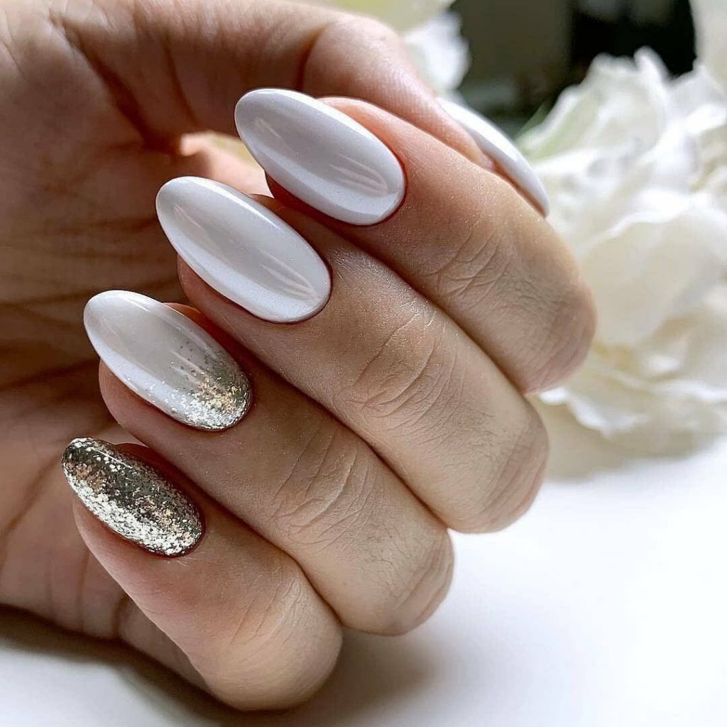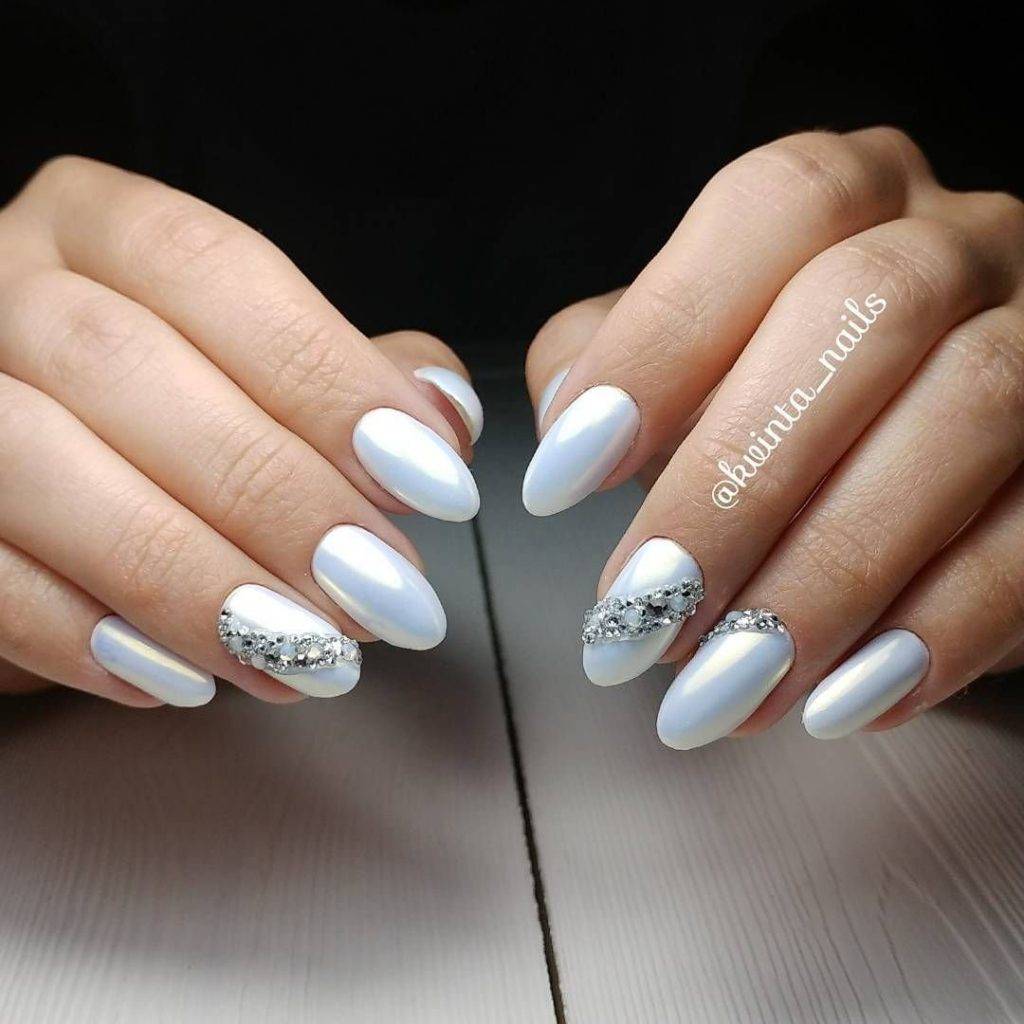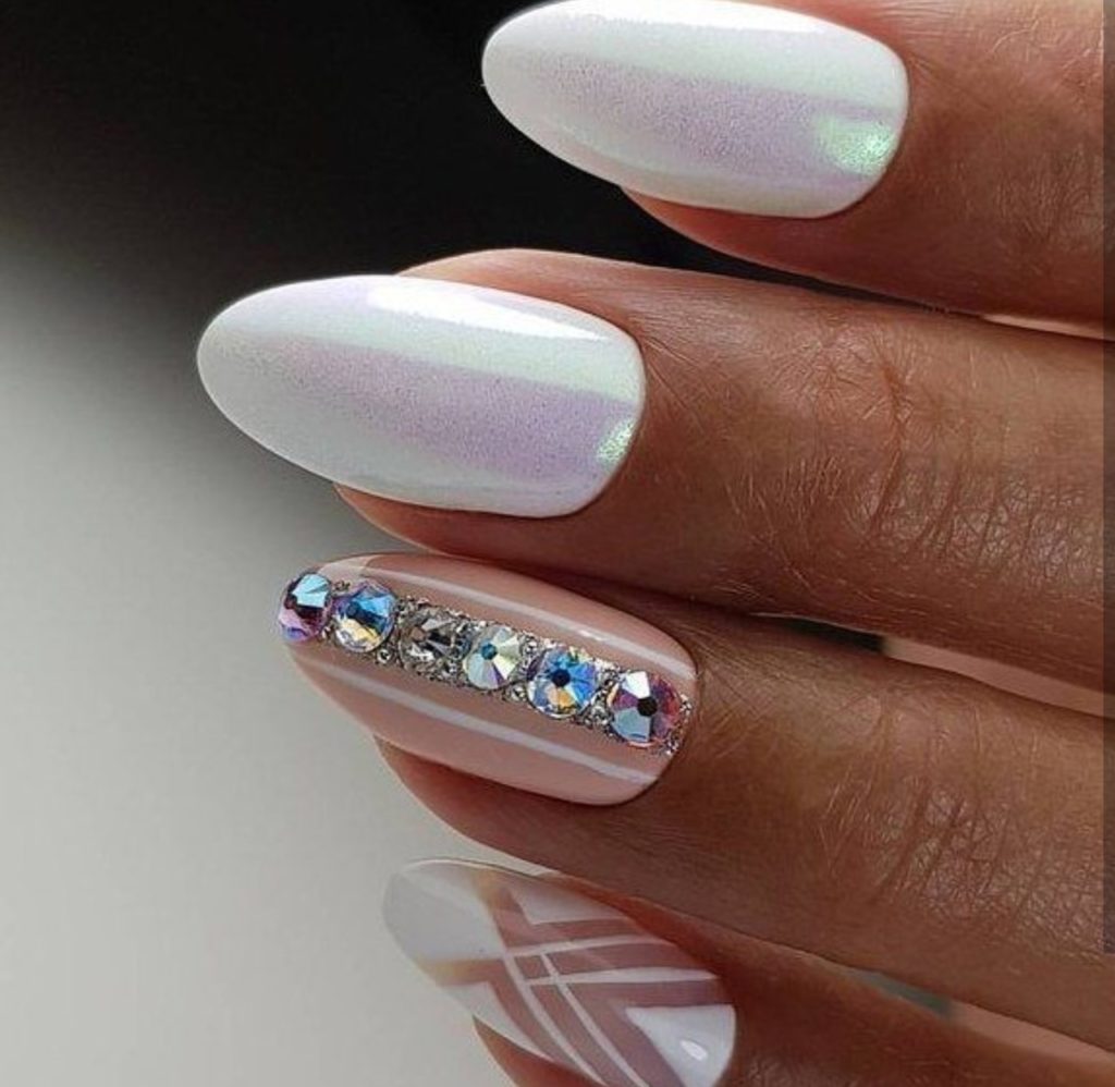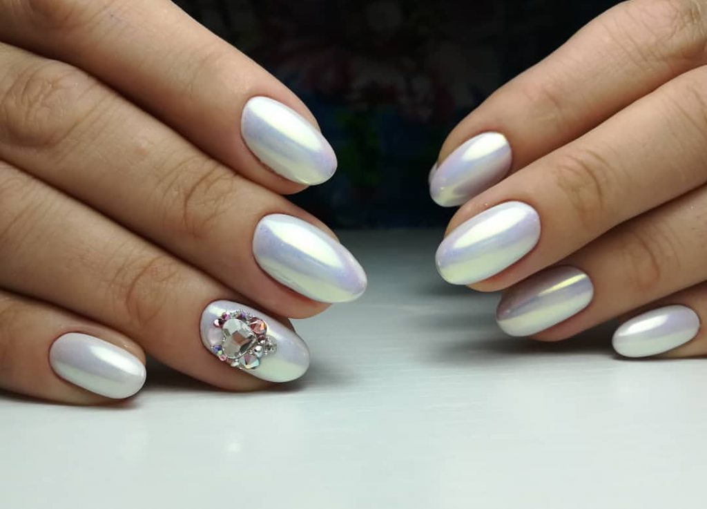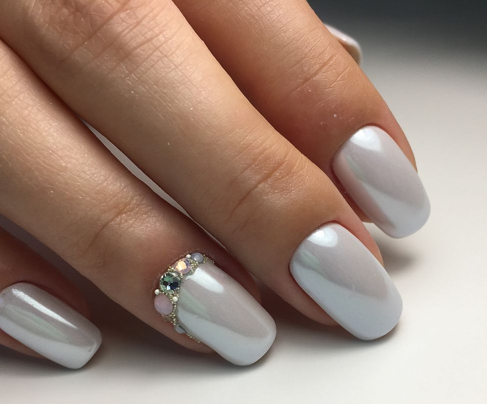 Если посмотреть на фото белого маникюра 2022 года, можно заметить, что все более популярным становится нейл-арт с втирками. Блеск, переливы, которые придает этот декоративный материал, эффектно смотрятся на белом фоне. В зависимости от основного тона втирки, получаются разные оттенки белого цвета с переливами, мерцанием.